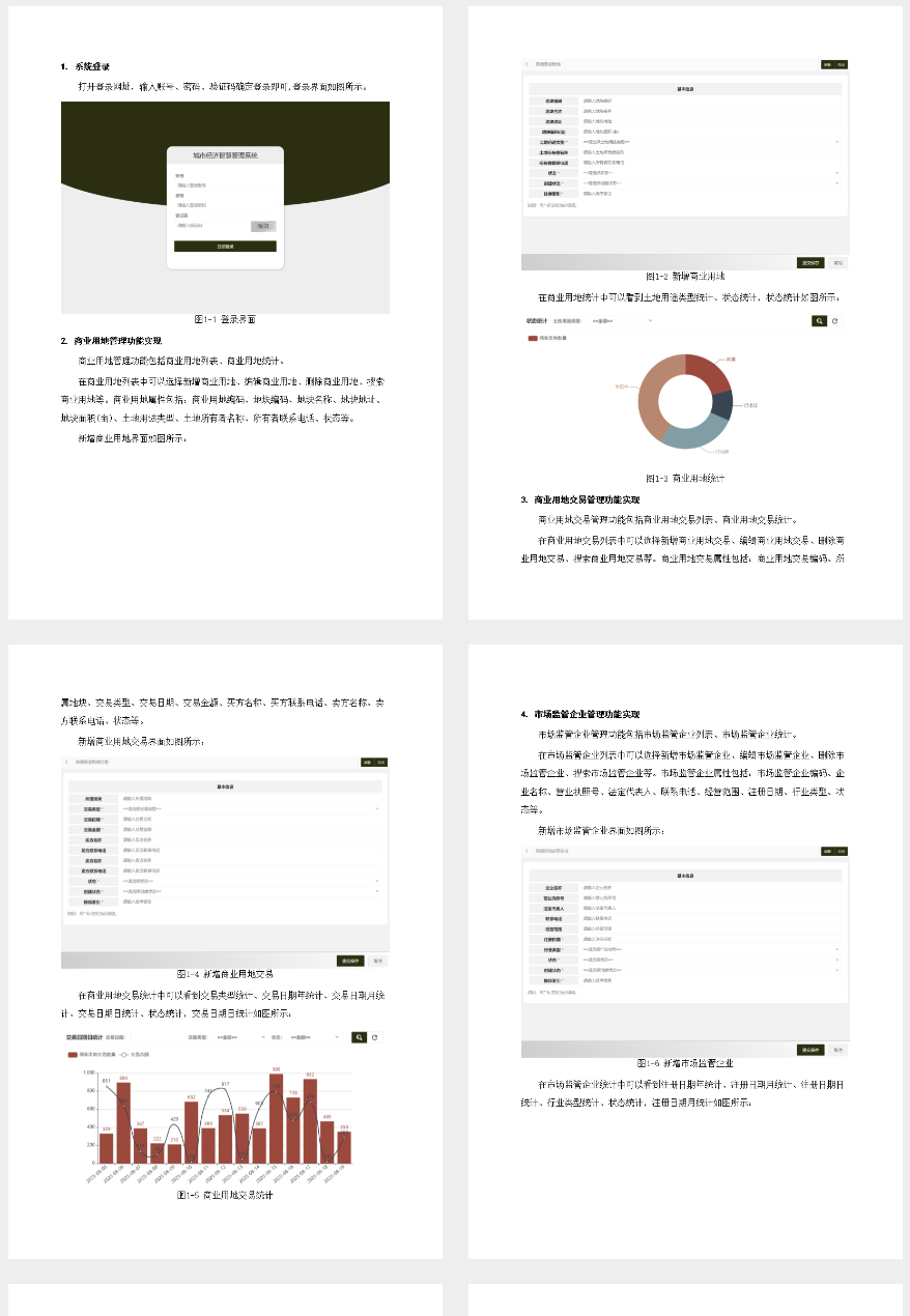 在商业用地交易管理中,主要涉及的角色包括普通员工和部门领导。普通员工负责录入、查阅执行及信息变更等操作;部门领导则进行数据审核与统计分析工作。具体而言,系统需要实现如下功能:1) 普通员工提交交易记录并上传相关证明文件;2) 系统自动校验资料完整性与合法性;3) 部门领导审批通过或退回修改意见,并生成审计报告。这将有效提升城市土地资源的流通效率和透明度,确保所有土地使用权变更活动均在合法合规框架内进行,从而促进地方经济健康稳定发展。