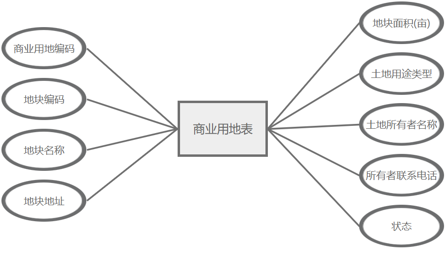 商业用地管理主要属性包括:商业用地编码、地块编码、地块名称、地块地址、地块面积(亩)、土地用途类型、土地所有者名称、所有者联系电话、状态。