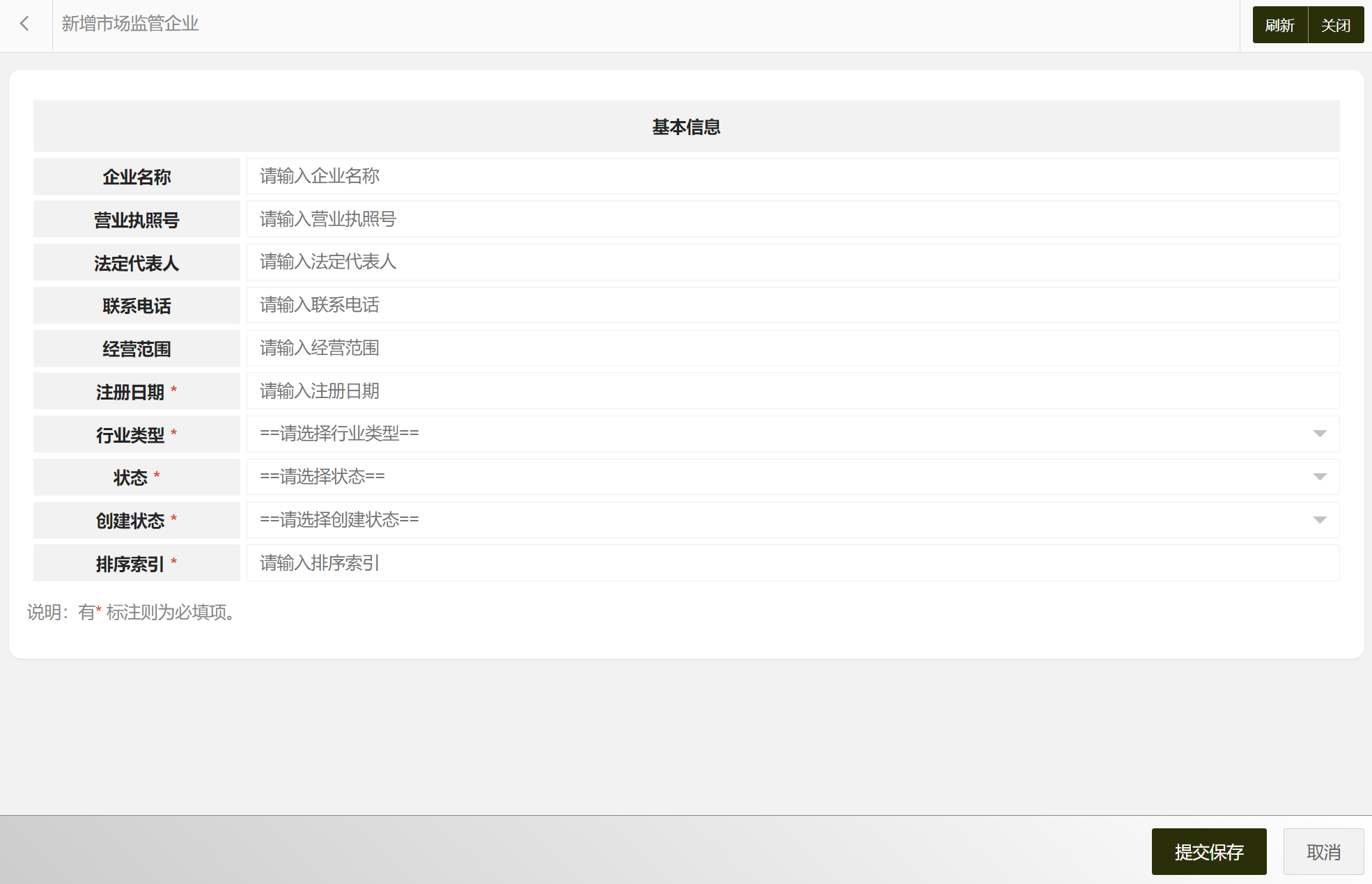 在市场监管企业列表中可以选择新增市场监管企业、编辑市场监管企业、删除市场监管企业、搜索市场监管企业等。市场监管企业属性包括:市场监管企业编码、企业名称、营业执照号、法定代表人、联系电话、经营范围、注册日期、行业类型、状态等。新增市场监管企业界面如图所示: