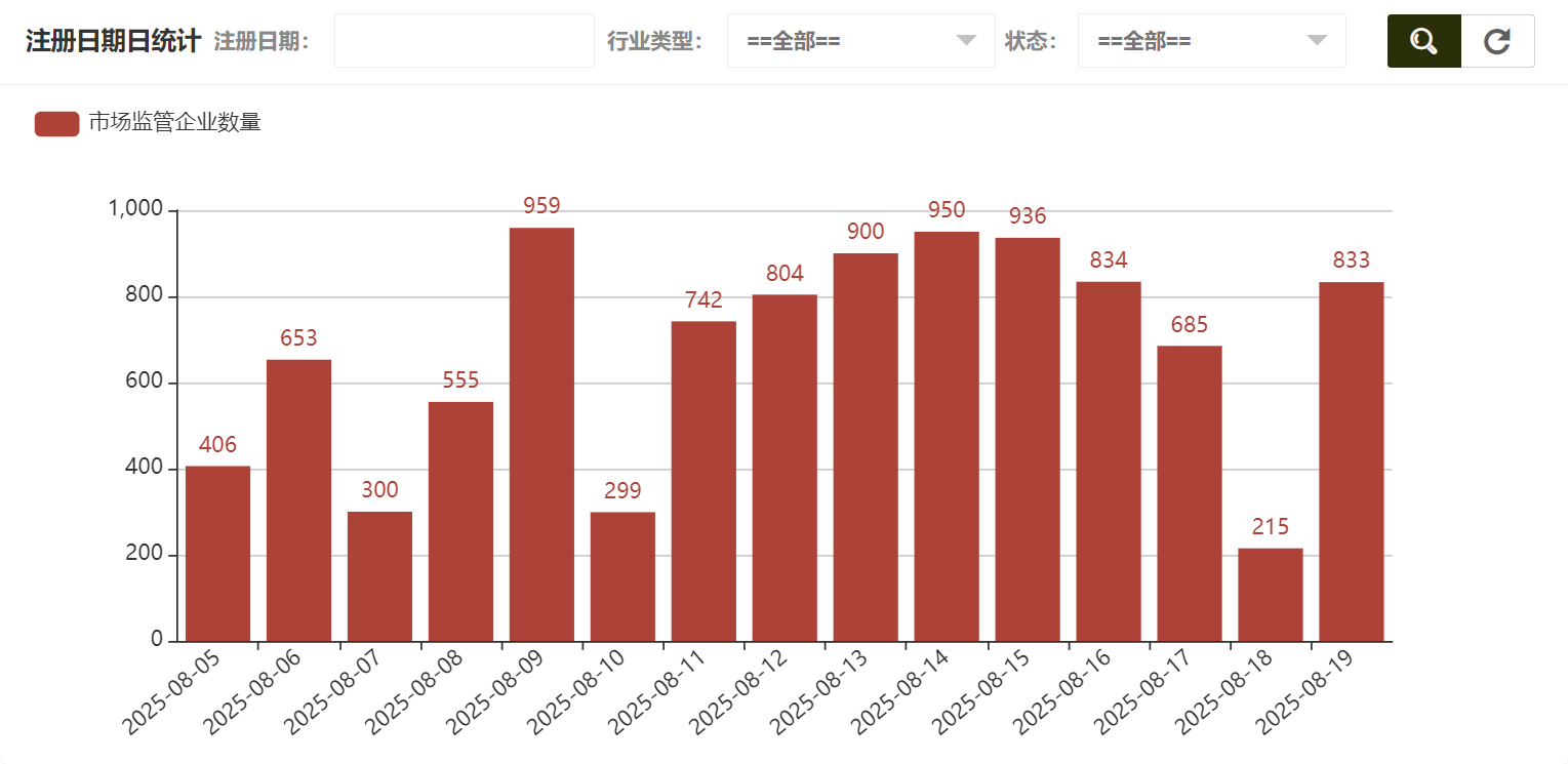 在市场监管企业统计中可以看到注册日期年统计、注册日期月统计、注册日期日统计、行业类型统计、状态统计,注册日期日统计如图所示: