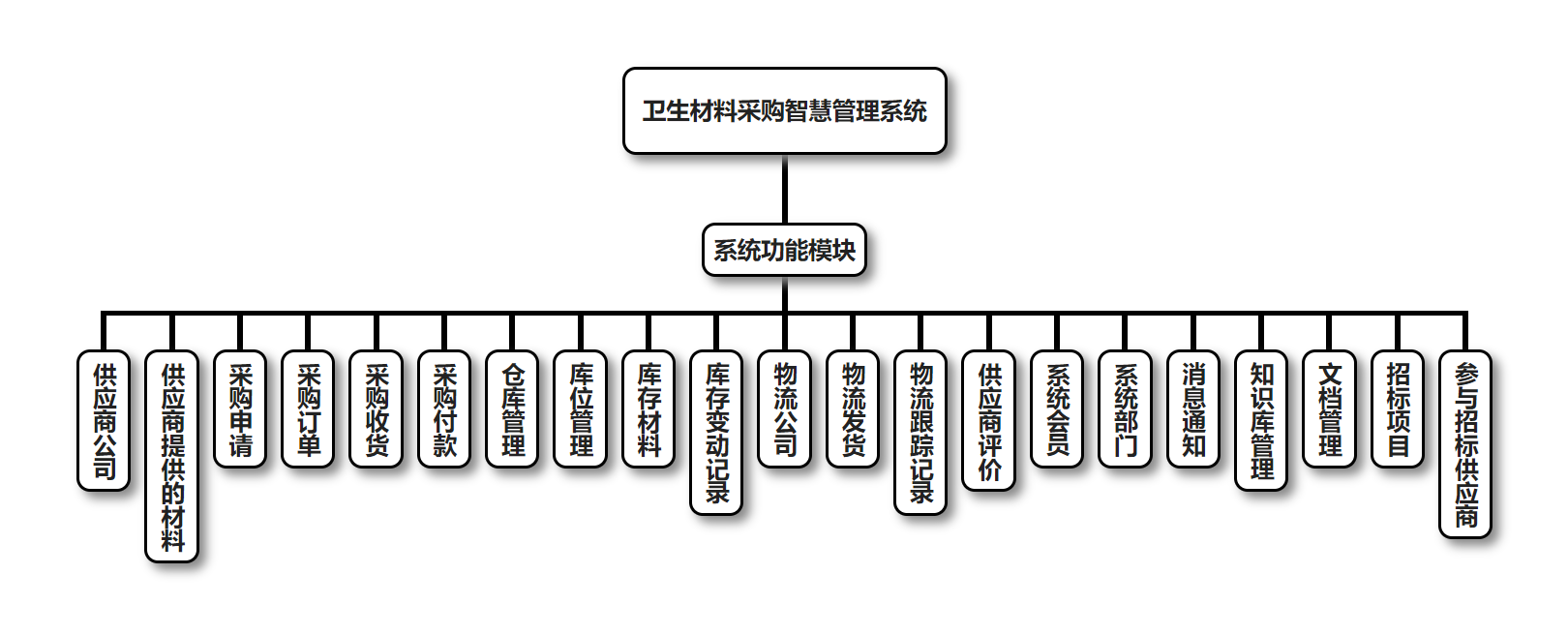 卫生材料采购智慧管理系统的主要功能包括:供应商公司管理、供应商提供的材料管理、采购申请管理、采购订单管理、采购收货管理、采购付款管理、仓库管理、库位管理、库存材料管理、库存变动记录管理、物流公司管理、物流发货管理、物流跟踪记录管理、供应商评价管理、系统会员管理、系统部门管理、消息通知管理、知识库管理、文档管理、招标项目管理、参与招标供应商管理。