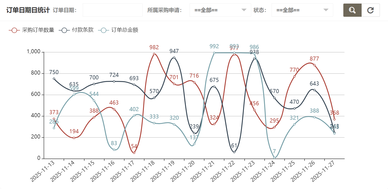 在采购订单统计中可以看到所属采购申请统计、订单日期年统计、订单日期月统计、订单日期日统计、期望交货日期年统计、期望交货日期月统计、期望交货日期日统计、状态统计,订单日期日统计如图所示: