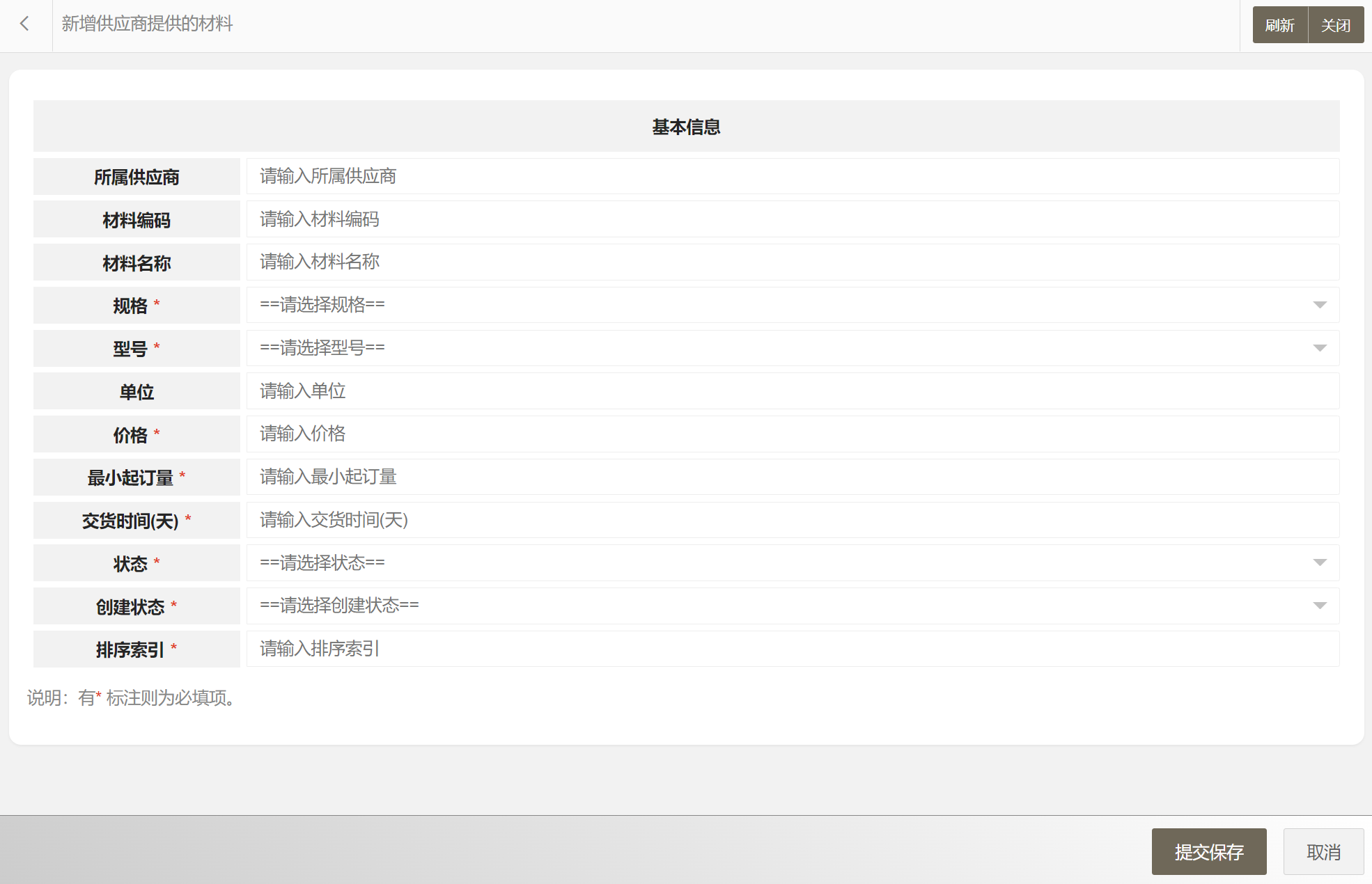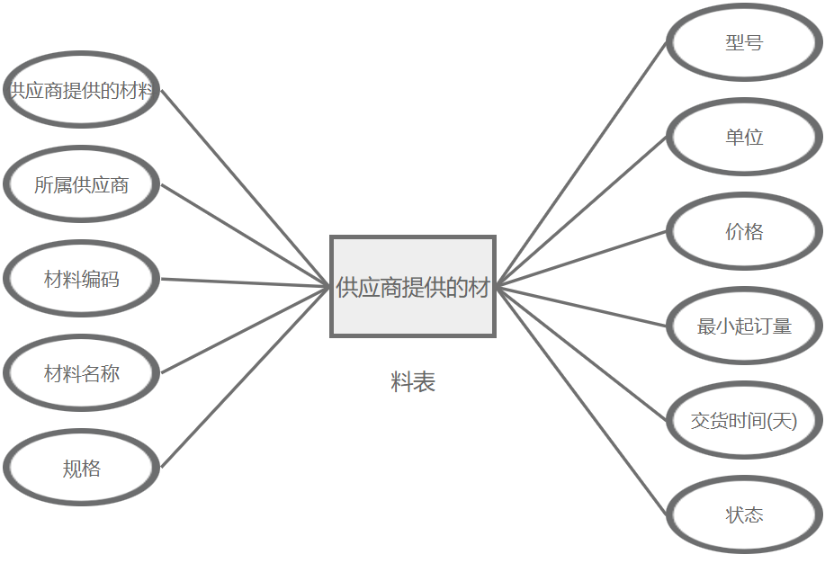 供应商提供的材料管理主要属性包括:供应商提供的材料编码、所属供应商、材料编码、材料名称、规格、型号、单位、价格、最小起订量、交货时间(天)、状态。