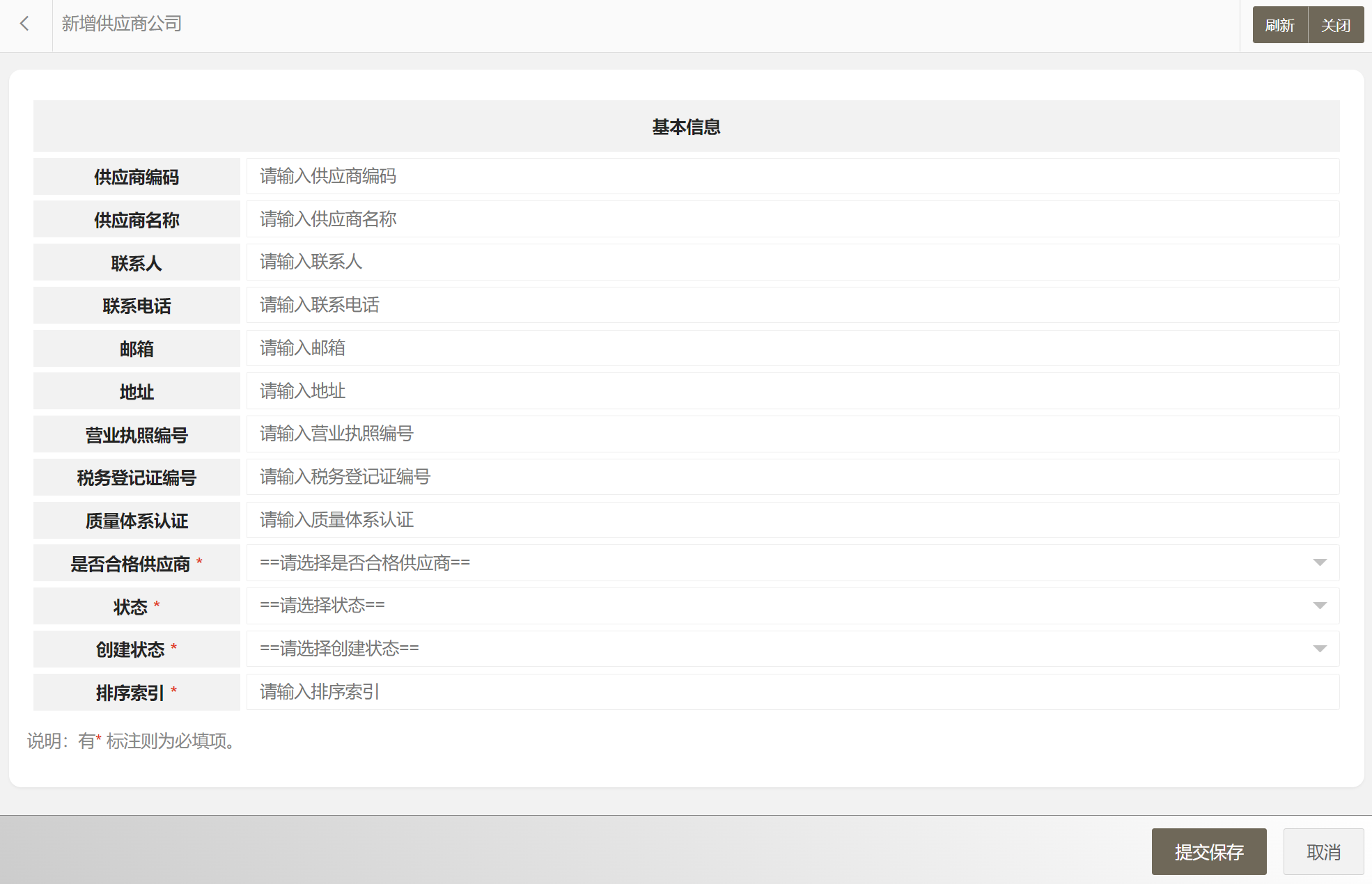 在供应商公司列表中可以选择新增供应商公司、编辑供应商公司、删除供应商公司、搜索供应商公司等。供应商公司属性包括:供应商公司编码、供应商编码、供应商名称、联系人、联系电话、邮箱、地址、营业执照编号、税务登记证编号、质量体系认证、是否合格供应商、状态等。新增供应商公司界面如图所示: