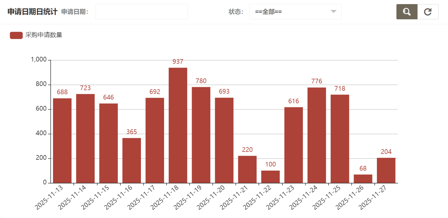 在采购申请统计中可以看到申请日期年统计、申请日期月统计、申请日期日统计、期望交货日期年统计、期望交货日期月统计、期望交货日期日统计、状态统计、审批日期年统计、审批日期月统计、审批日期日统计,申请日期日统计如图所示: