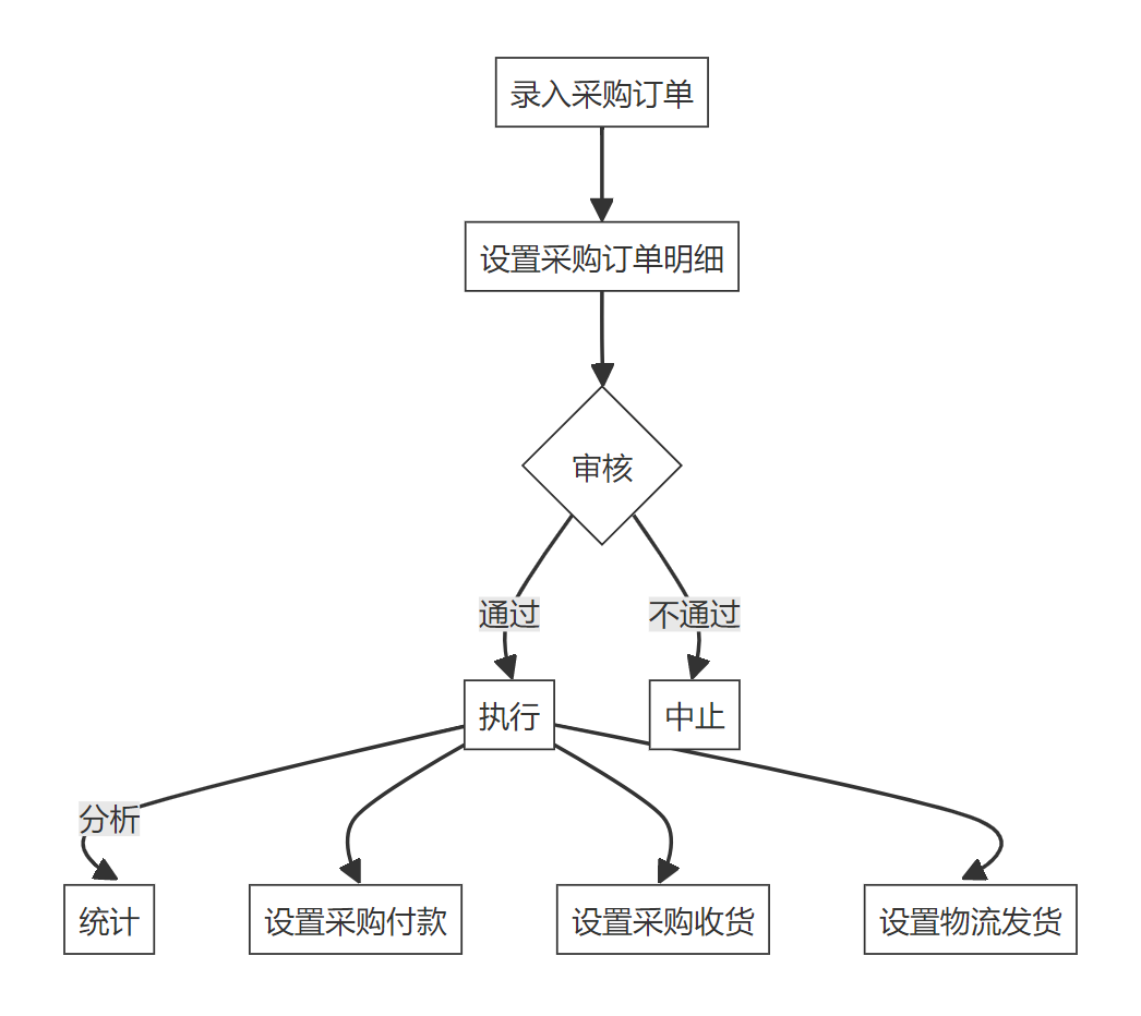 采购订单管理功能包括采购订单列表、采购订单统计。