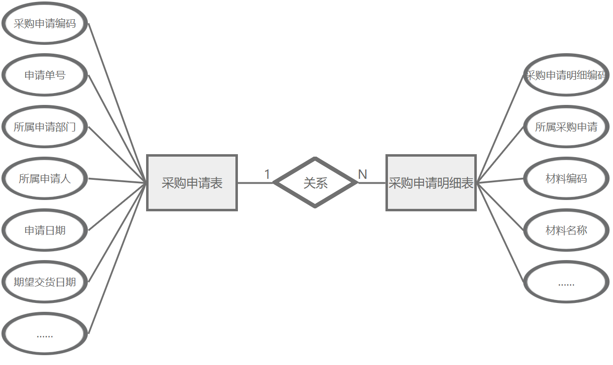 采购申请管理主要属性包括:采购申请编码、申请单号、所属申请部门、所属申请人、申请日期、期望交货日期、申请原因、状态、所属审批人、审批日期、审批意见。