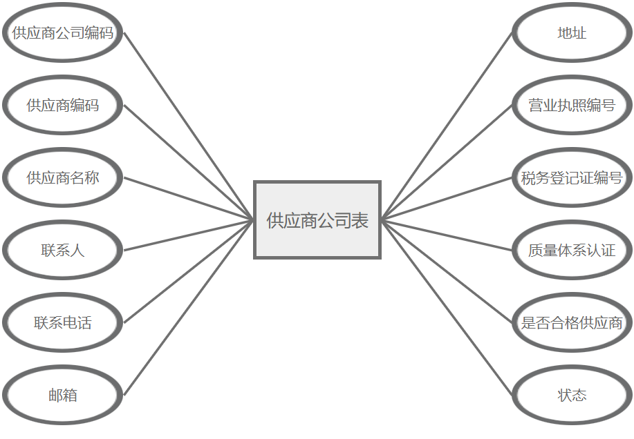 供应商公司管理主要属性包括:供应商公司编码、供应商编码、供应商名称、联系人、联系电话、邮箱、地址、营业执照编号、税务登记证编号、质量体系认证、是否合格供应商、状态。