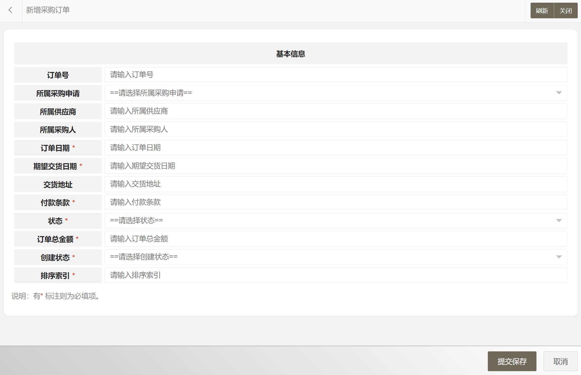 在采购订单列表中可以选择新增采购订单、编辑采购订单、删除采购订单、搜索采购订单等。采购订单属性包括:采购订单编码、订单号、所属采购申请、所属供应商、所属采购人、订单日期、期望交货日期、交货地址、付款条款、状态、订单总金额等。新增采购订单界面如图所示: