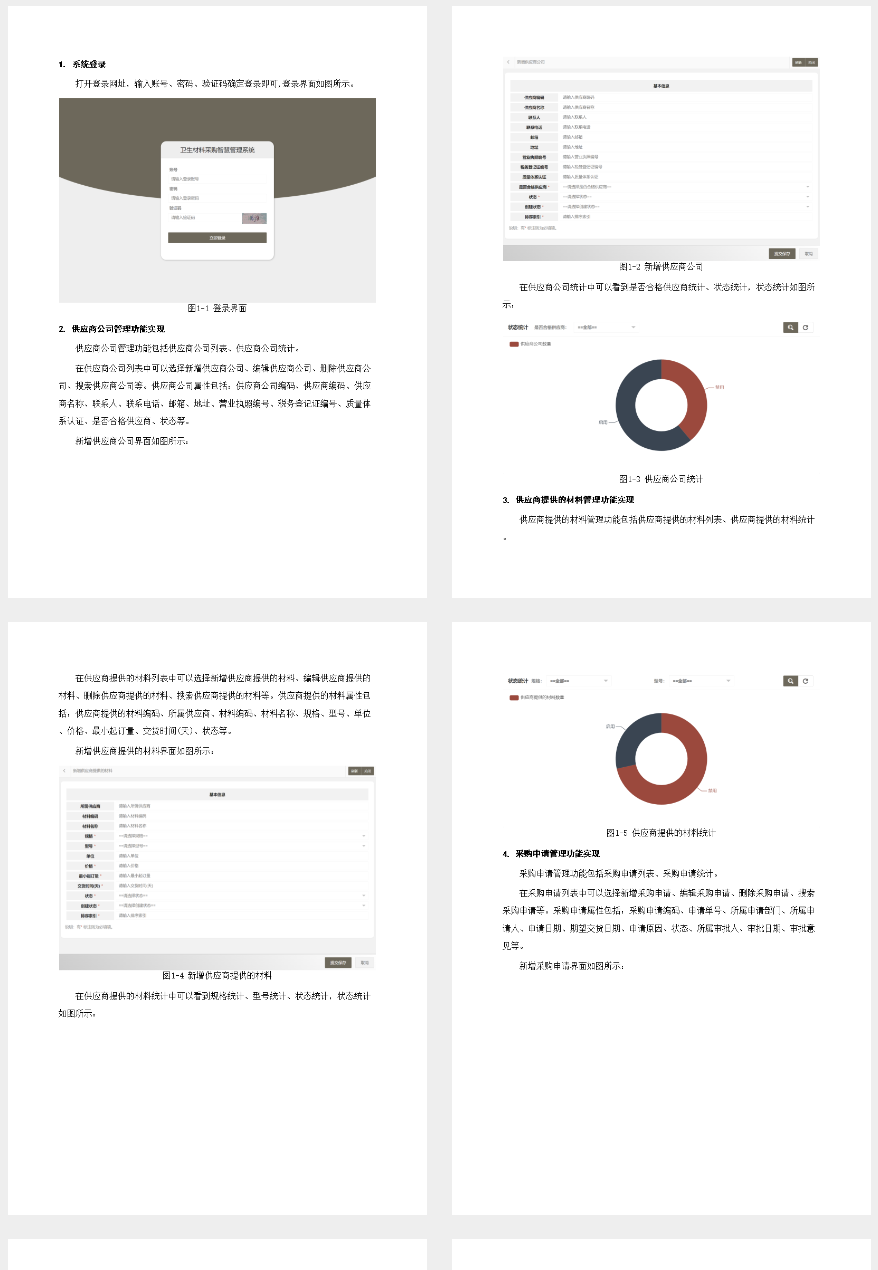 卫生材料采购智慧管理系统是一个全面覆盖从供应商管理到仓库库存控制的多层次系统,它能够显著提高医院等机构在物资采购过程中的效率和管理水平。相比传统的纸质记录方法或单一功能模块的应用程序,该系统的优势在于其一体化的设计思路与数据互通性,不仅涵盖了所有必需的功能模块,还实现了不同角色之间的权限分离和操作便利。 本系统主要面向普通员工与部门领导两大用户群体设计,并根据各自的职责设置了相应的管理界面。对于采购流程中的各个环节如申请、订单生成及收货等进行详细记录并跟踪其状态变化;同时支持供应商信息的全面管理和评价,确保选择最合适的合作伙伴。此外还提供知识库和文档管理系统来支撑日常运营所需的信息查询与存档工作。 系统采用SpringMVC作为后端开发框架,并使用MySQL数据库存储各类数据表及元数据。整个系统的可视化界面设计遵循简洁高效原则,以增强用户体验为主要目标;前端则结合HTML5、CSS3以及JavaScript实现动态交互效果和响应式布局。通过集成ECharts.js等图表库来展示关键指标的变化趋势分析。 系统开发难度适中,适合具有一定基础的开发者学习与实践,并能快速搭建起满足实际需求的应用环境。这使得零基础的学习者也能轻松掌握并进行功能扩展或优化调整。