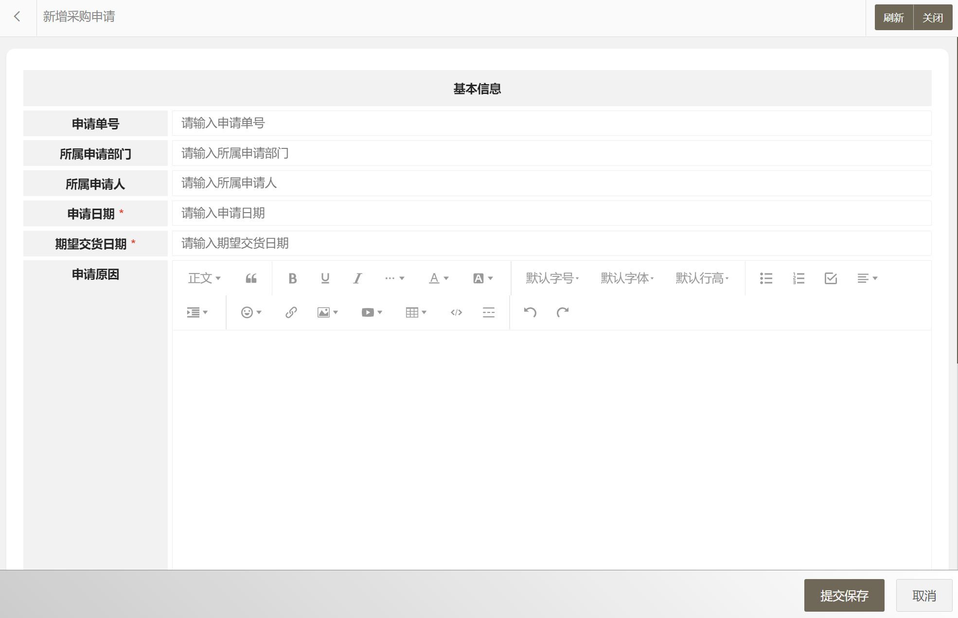 在采购申请列表中可以选择新增采购申请、编辑采购申请、删除采购申请、搜索采购申请等。采购申请属性包括:采购申请编码、申请单号、所属申请部门、所属申请人、申请日期、期望交货日期、申请原因、状态、所属审批人、审批日期、审批意见等。新增采购申请界面如图所示: