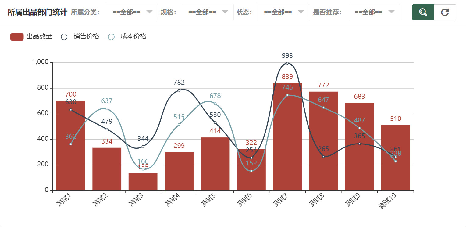 在出品统计中可以看到所属分类统计、所属出品部门统计、规格统计、状态统计、是否推荐统计,所属出品部门统计如图所示: