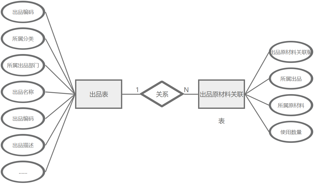 出品管理主要属性包括:出品编码、所属分类、所属出品部门、出品名称、出品编码、出品描述、规格、销售价格、成本价格、图片URL、状态、是否推荐。