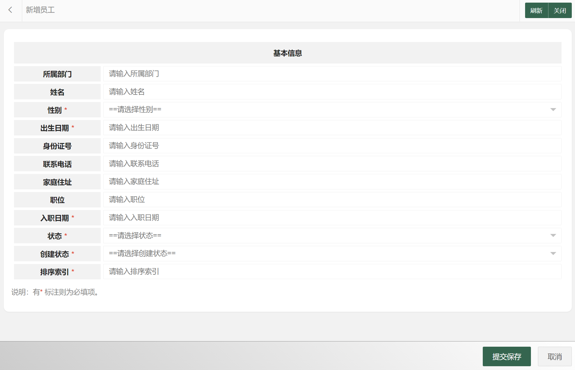 在员工列表中可以选择新增员工、编辑员工、删除员工、搜索员工等。员工属性包括:员工编码、所属部门、姓名、性别、出生日期、身份证号、联系电话、家庭住址、职位、入职日期、状态等。新增员工界面如图所示: