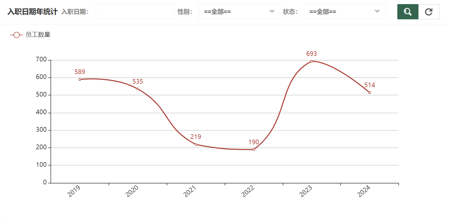 在员工统计中可以看到性别统计、出生日期年统计、出生日期月统计、出生日期日统计、入职日期年统计、入职日期月统计、入职日期日统计、状态统计,入职日期年统计如图所示: