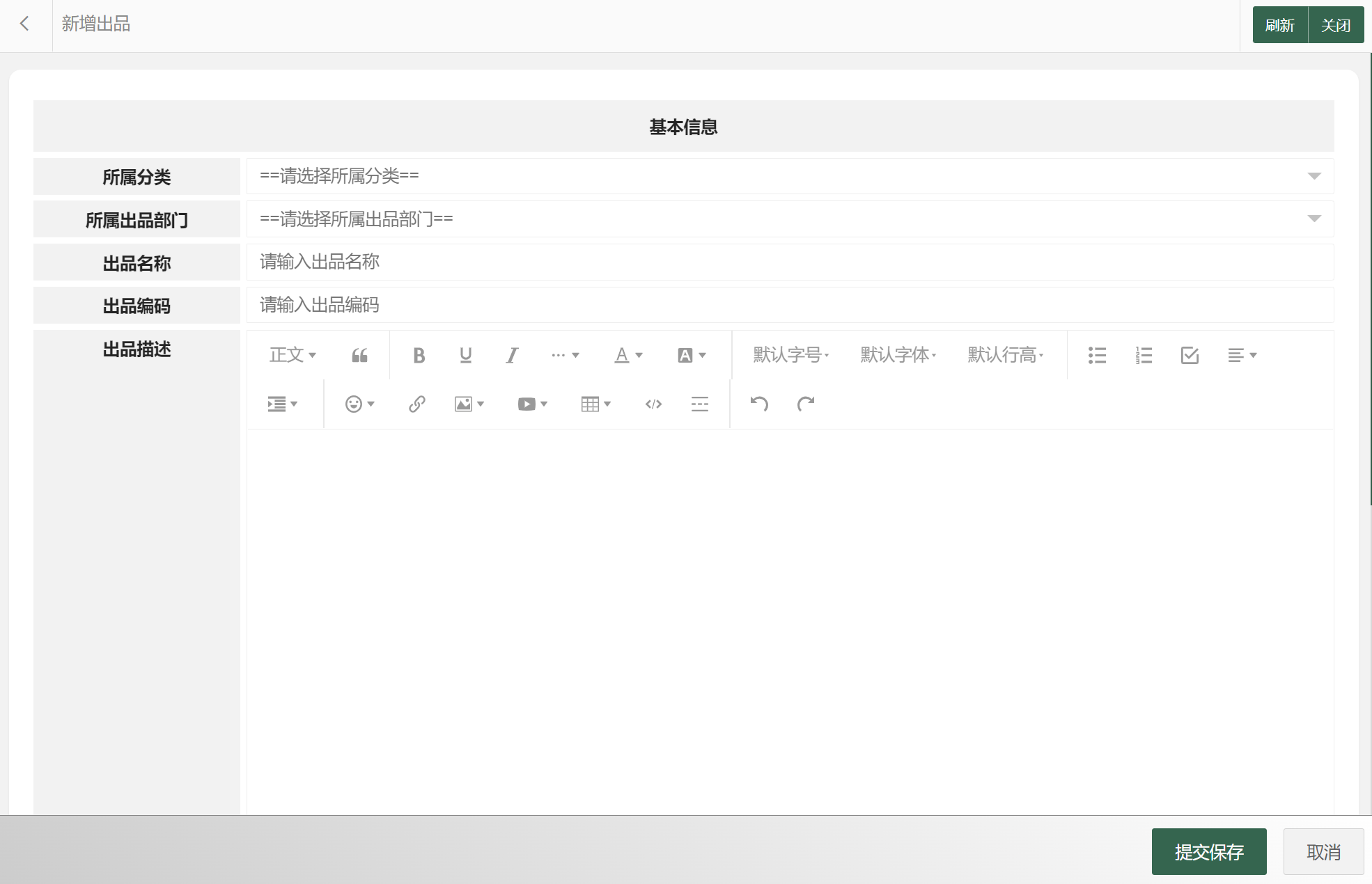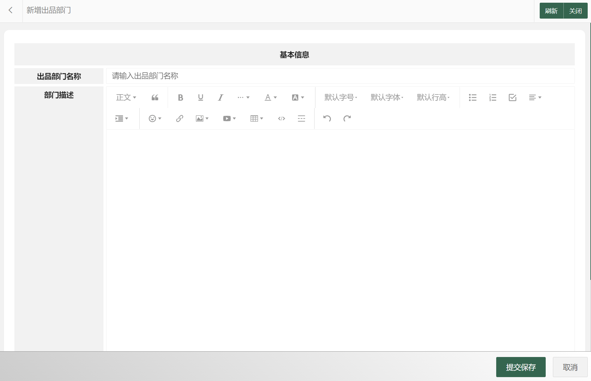 在出品部门列表中可以选择新增出品部门、编辑出品部门、删除出品部门、搜索出品部门等。出品部门属性包括:出品部门编码、出品部门名称、部门描述、状态等。新增出品部门界面如图所示: