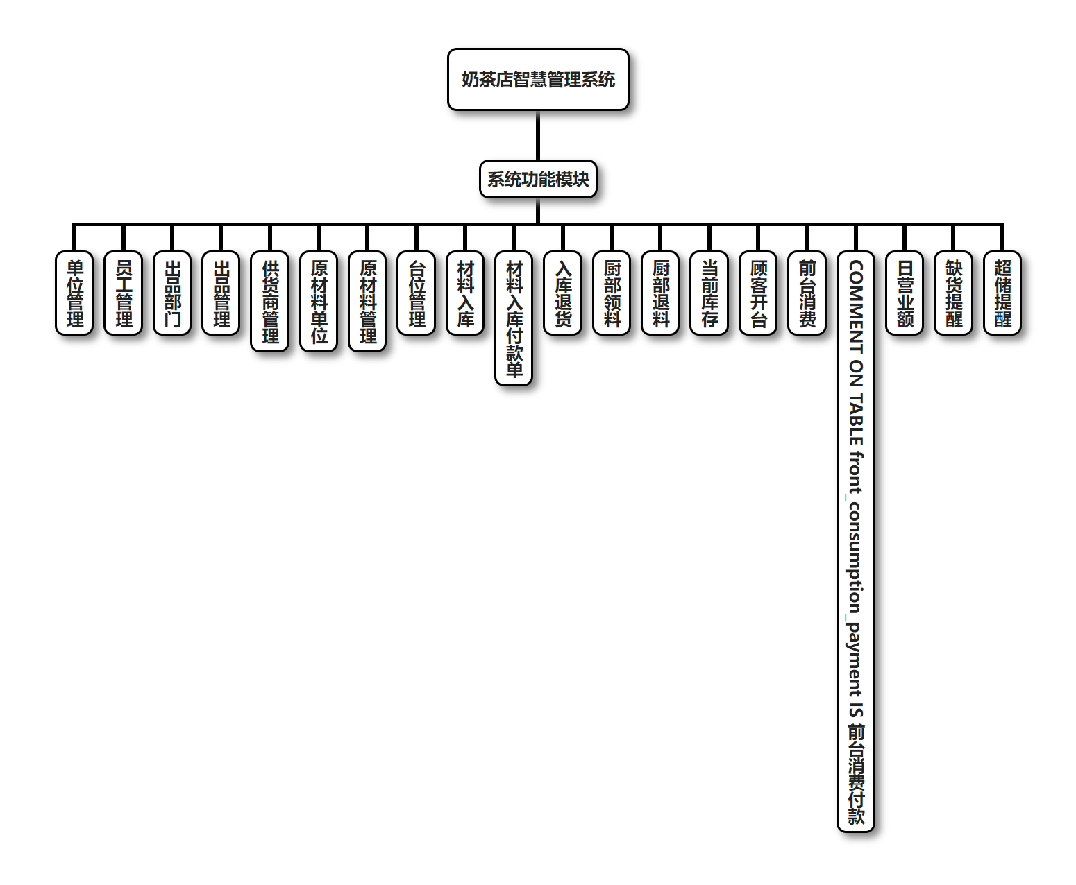 奶茶店智慧管理系统的主要功能包括:单位管理、员工管理、出品部门管理、出品管理、供货商管理、原材料单位管理、原材料管理、台位管理、材料入库管理、材料入库付款单管理、入库退货管理、厨部领料管理、厨部退料管理、当前库存管理、顾客开台管理、前台消费管理、COMMENT ON TABLE front_consumption_payment IS 前台消费付款管理、日营业额管理、缺货提醒管理、超储提醒管理。