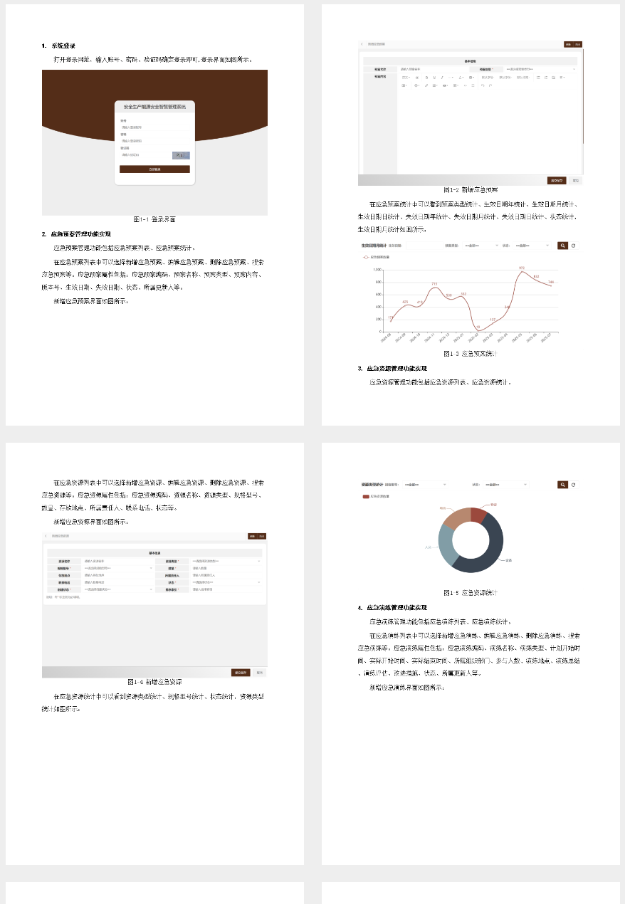 应急资源管理功能定义包括数据录入、查询、变更、审核及统计分析。普通员工负责录入应急物资信息,如编码、名称、类型等;部门领导可进行数据查阅与更新责任人信息。系统支持状态修改与数量调整操作,并需经过审批确认后生效。系统提供多维度统计报表供管理层使用,涵盖资源存量分布与利用率评估等内容,确保高效安全管理。