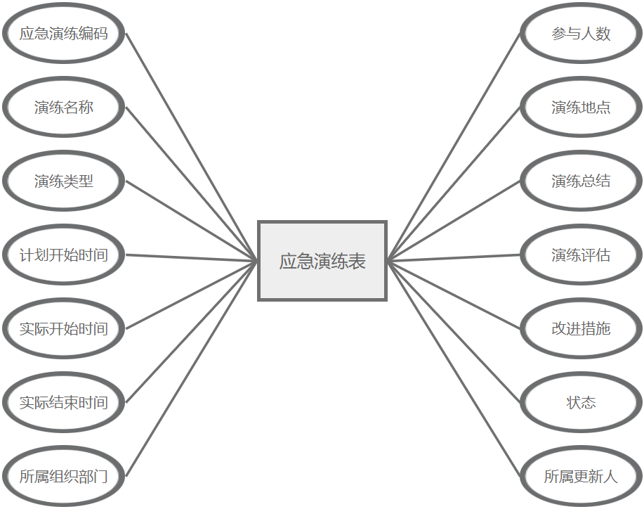 应急演练管理主要属性包括:应急演练编码、演练名称、演练类型、计划开始时间、实际开始时间、实际结束时间、所属组织部门、参与人数、演练地点、演练总结、演练评估、改进措施、状态、所属更新人。