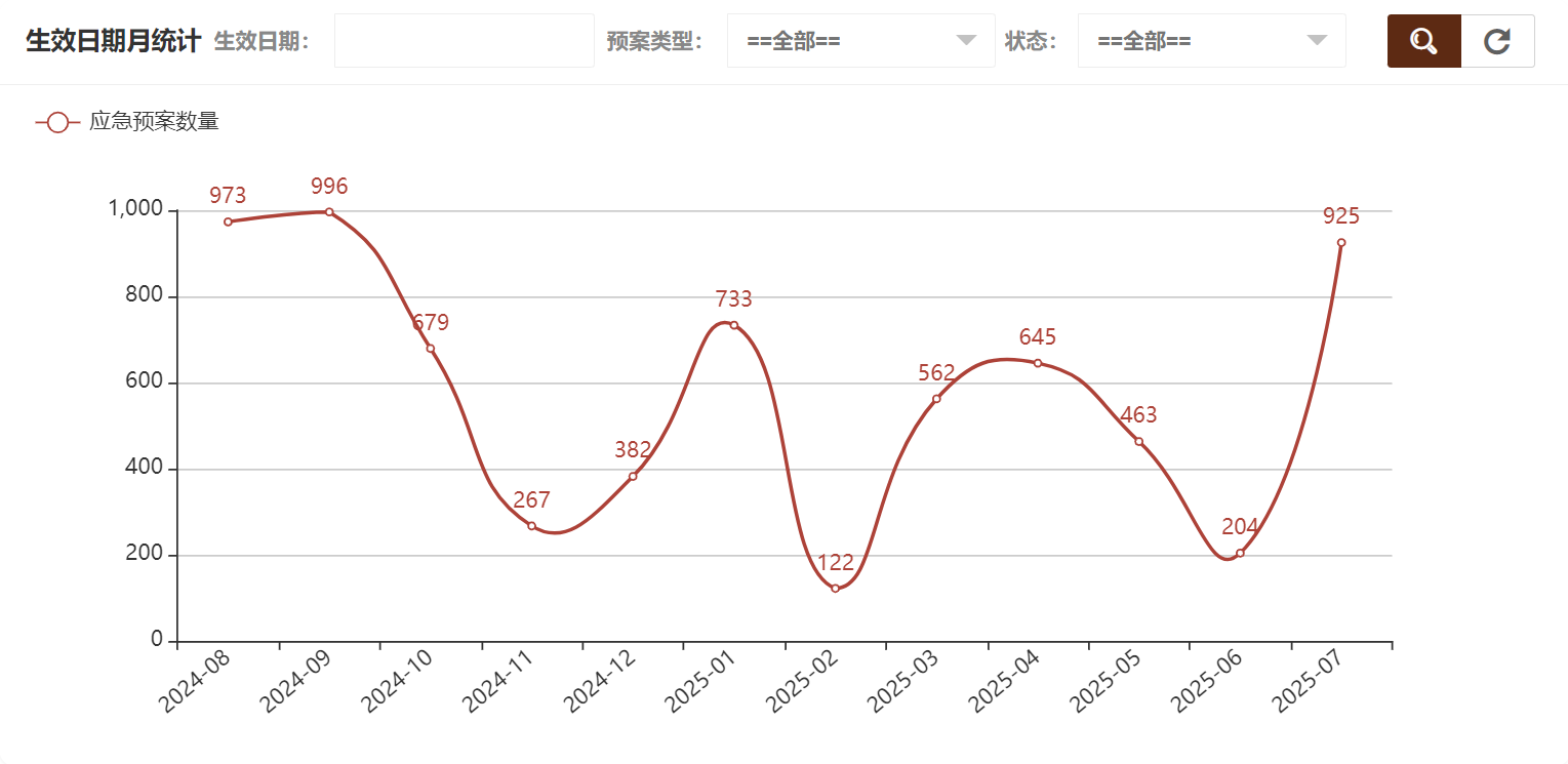 在应急预案统计中可以看到预案类型统计、生效日期年统计、生效日期月统计、生效日期日统计、失效日期年统计、失效日期月统计、失效日期日统计、状态统计,生效日期月统计如图所示: