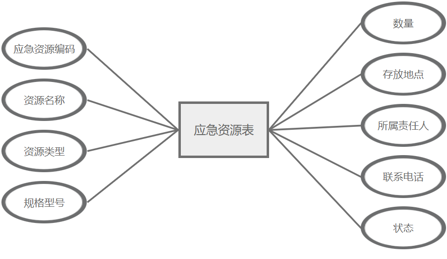 应急资源管理主要属性包括:应急资源编码、资源名称、资源类型、规格型号、数量、存放地点、所属责任人、联系电话、状态。