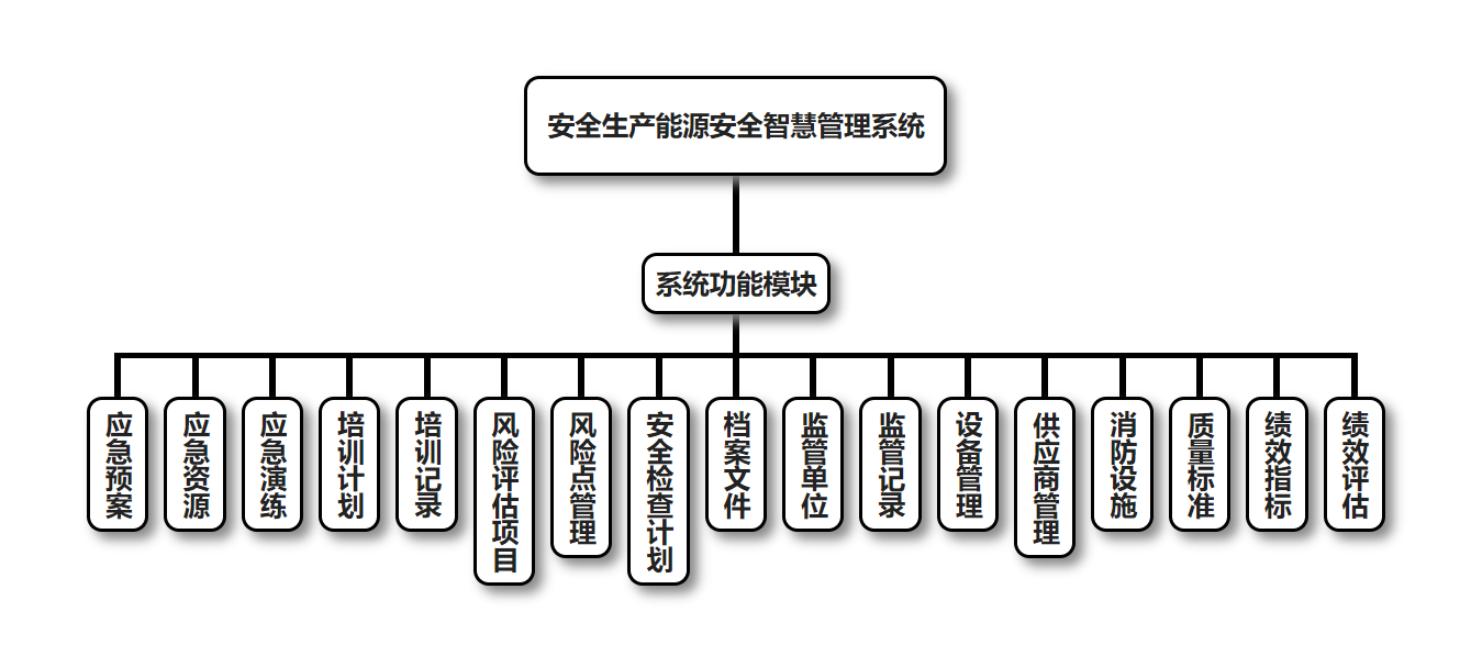安全生产能源安全智慧管理系统的主要功能包括:应急预案管理、应急资源管理、应急演练管理、培训计划管理、培训记录管理、风险评估项目管理、风险点管理、安全检查计划管理、档案文件管理、监管单位管理、监管记录管理、设备管理、供应商管理、消防设施管理、质量标准管理、绩效指标管理、绩效评估管理。