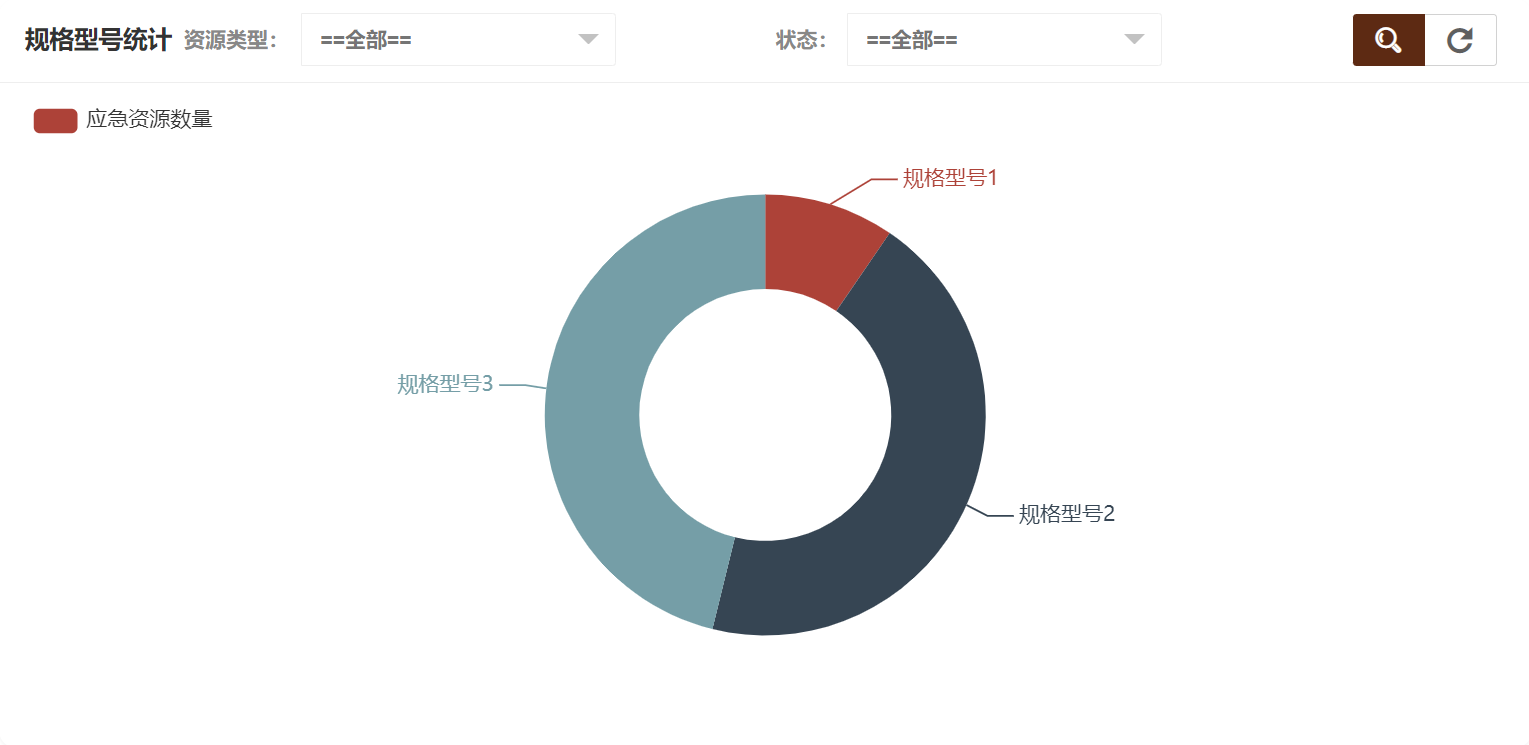 在应急资源统计中可以看到资源类型统计、规格型号统计、状态统计,规格型号统计如图所示:
