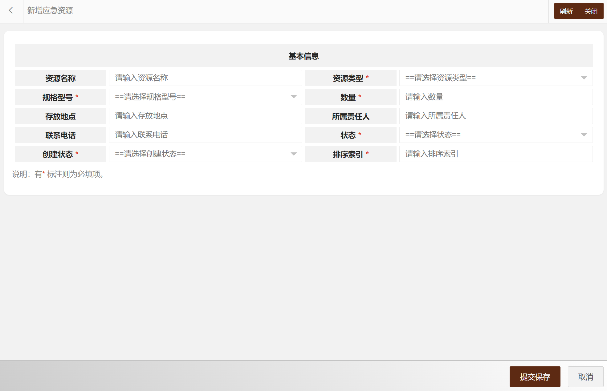 在应急资源列表中可以选择新增应急资源、编辑应急资源、删除应急资源、搜索应急资源等。应急资源属性包括:应急资源编码、资源名称、资源类型、规格型号、数量、存放地点、所属责任人、联系电话、状态等。新增应急资源界面如图所示:
