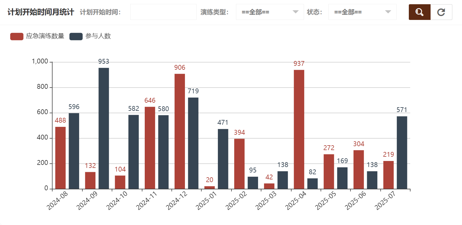在应急演练统计中可以看到演练类型统计、计划开始时间年统计、计划开始时间月统计、计划开始时间日统计、实际开始时间年统计、实际开始时间月统计、实际开始时间日统计、实际结束时间年统计、实际结束时间月统计、实际结束时间日统计、状态统计,计划开始时间月统计如图所示: