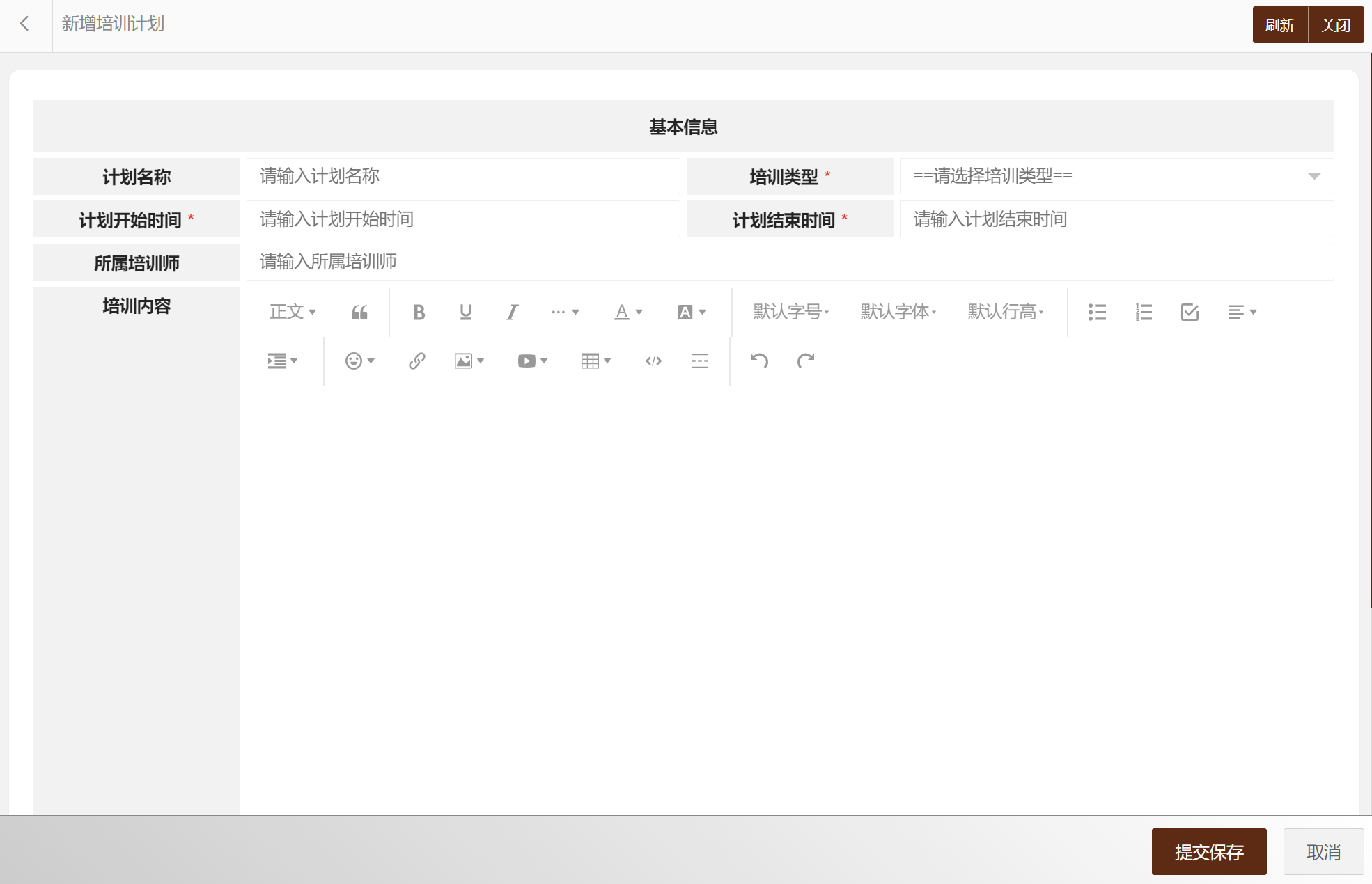 在培训计划列表中可以选择新增培训计划、编辑培训计划、删除培训计划、搜索培训计划等。培训计划属性包括:培训计划编码、计划名称、培训类型、计划开始时间、计划结束时间、所属培训师、培训内容、培训地点、参与人数、状态、所属更新人等。新增培训计划界面如图所示: