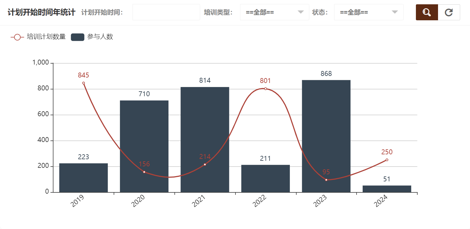 在培训计划统计中可以看到培训类型统计、计划开始时间年统计、计划开始时间月统计、计划开始时间日统计、计划结束时间年统计、计划结束时间月统计、计划结束时间日统计、状态统计,计划开始时间年统计如图所示: