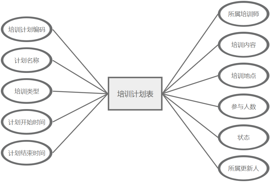 培训计划管理主要属性包括:培训计划编码、计划名称、培训类型、计划开始时间、计划结束时间、所属培训师、培训内容、培训地点、参与人数、状态、所属更新人。