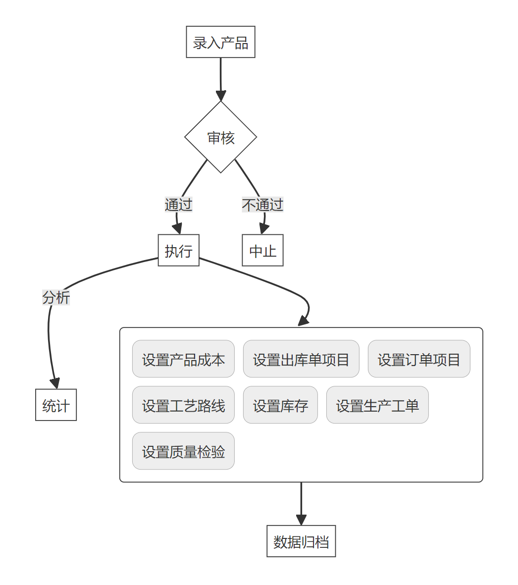 产品管理功能定义涵盖数据录入、查询、变更及审核,具体包括:1)录入时需输入产品编码、名称、型号等基本信息;2)支持按多种条件进行检索和查看详细信息;3)提供修改或新增字段如规格、材质、设计参数等功能;4)部门领导可对普通员工提交的产品数据进行审核确认;5)统计分析模块汇总并展示各类关键指标,辅助决策。