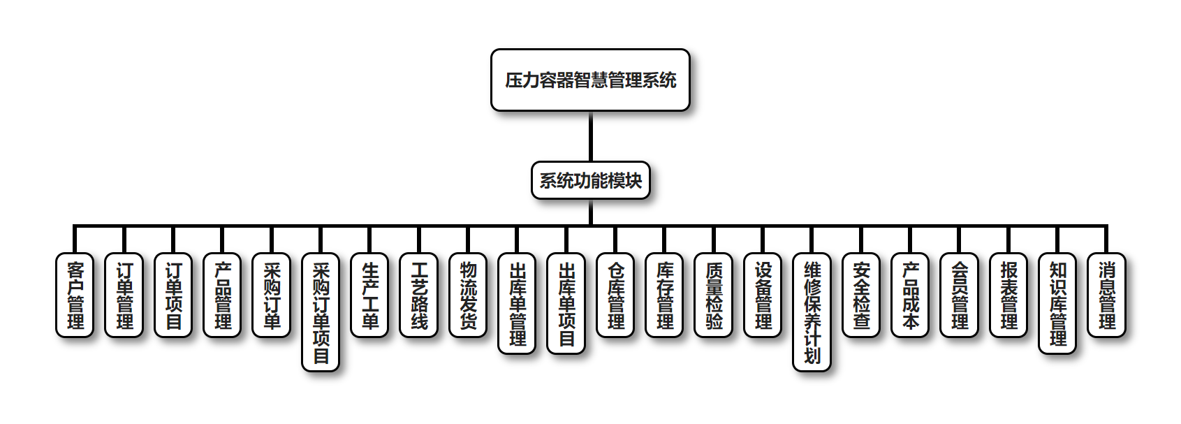 压力容器智慧管理系统的主要功能包括:客户管理、订单管理、订单项目管理、产品管理、采购订单管理、采购订单项目管理、生产工单管理、工艺路线管理、物流发货管理、出库单管理、出库单项目管理、仓库管理、库存管理、质量检验管理、设备管理、维修保养计划管理、安全检查管理、产品成本管理、会员管理、报表管理、知识库管理、消息管理。