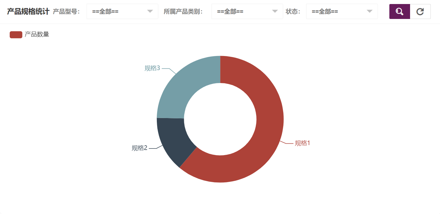 在产品统计中可以看到产品型号统计、产品规格统计、所属产品类别统计、状态统计,产品规格统计如图所示: