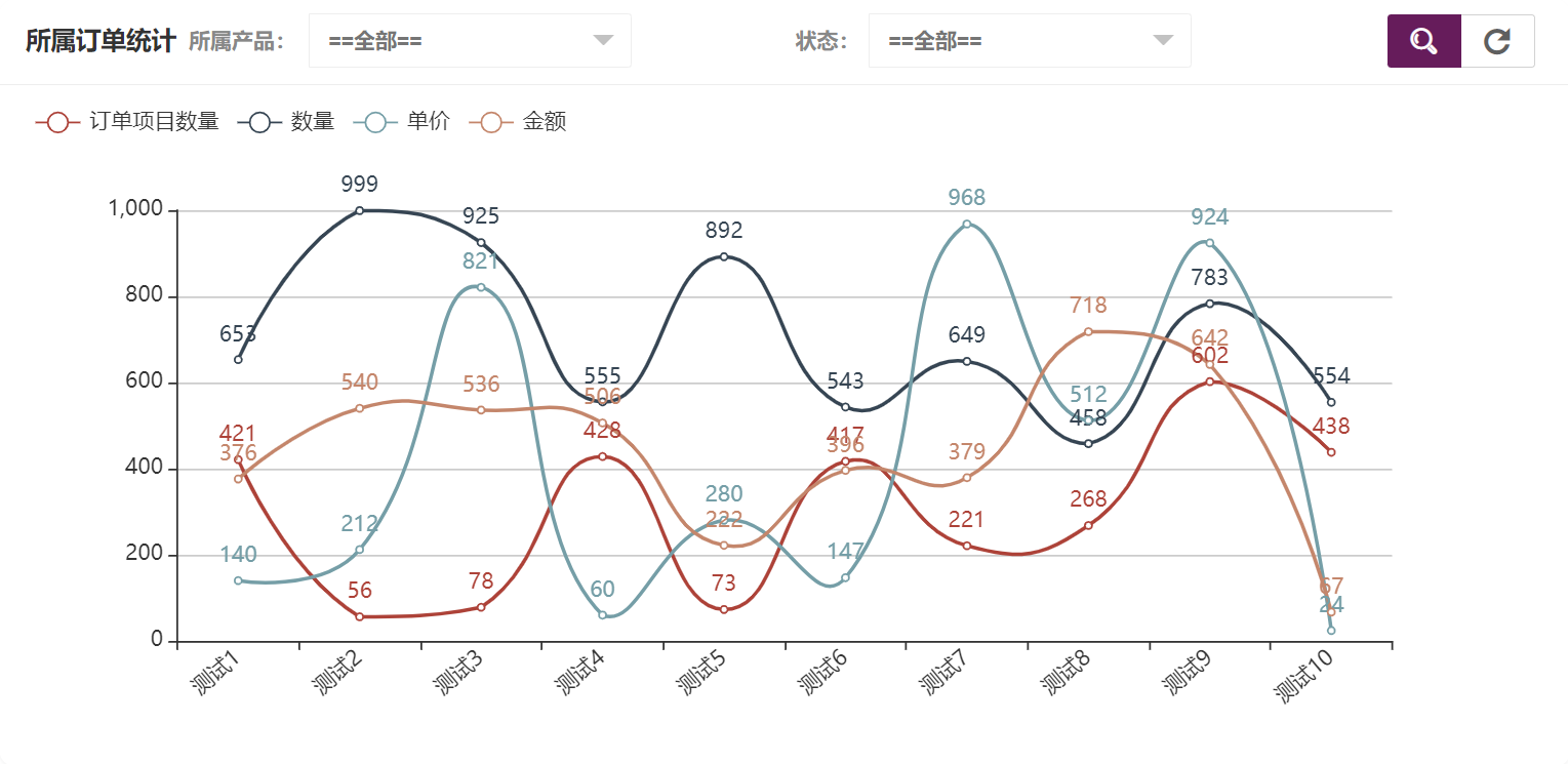 在订单项目统计中可以看到所属订单统计、所属产品统计、状态统计,所属订单统计如图所示: