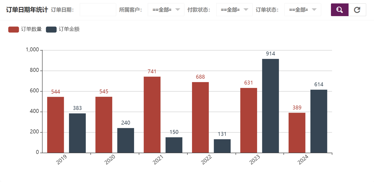 在订单统计中可以看到所属客户统计、订单日期年统计、订单日期月统计、订单日期日统计、交货日期年统计、交货日期月统计、交货日期日统计、付款状态统计、订单状态统计,订单日期年统计如图所示: