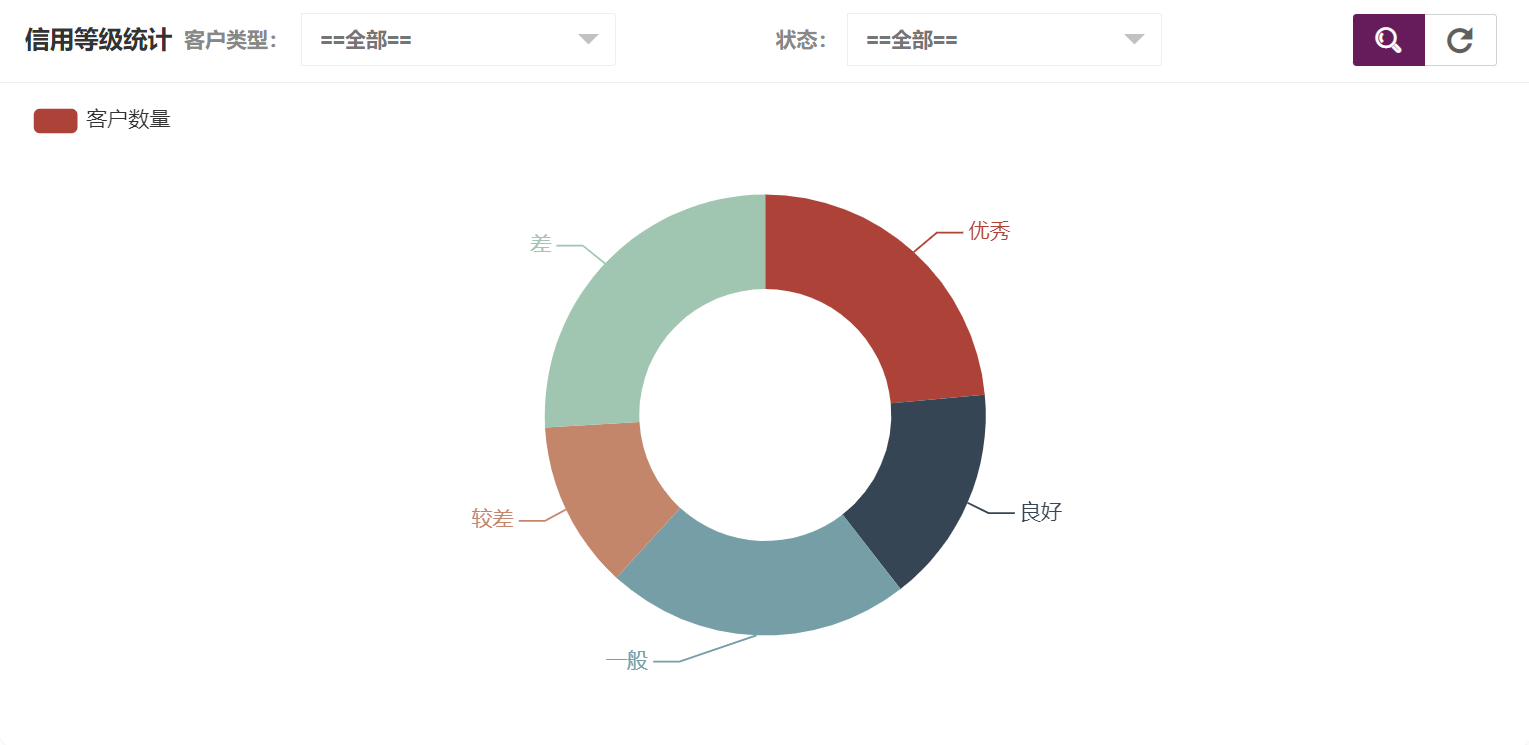 在客户统计中可以看到客户类型统计、信用等级统计、状态统计,信用等级统计如图所示: