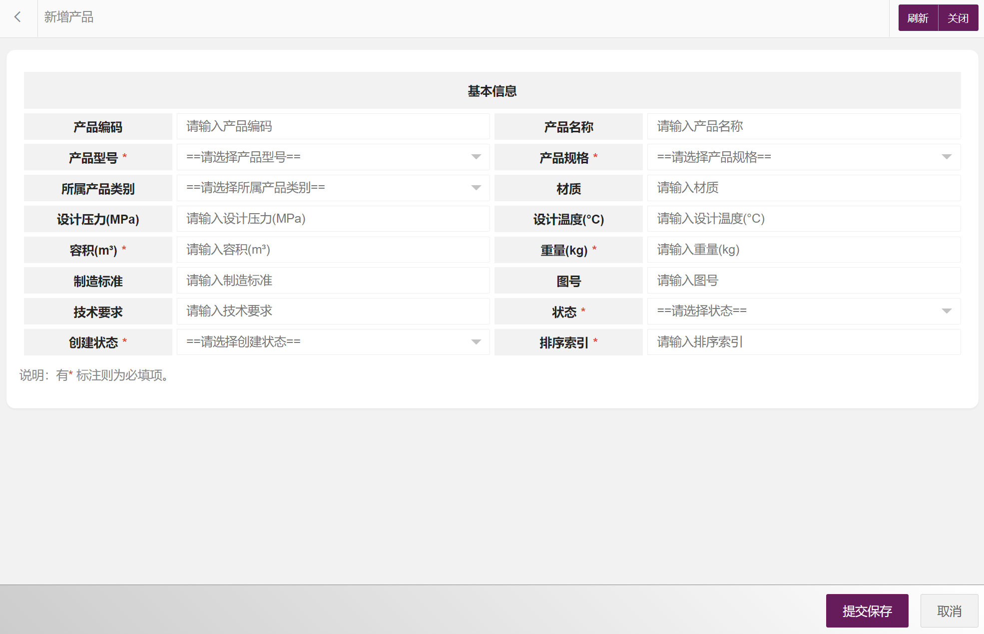 产品管理主要属性包括:产品编码、产品编码、产品名称、产品型号、产品规格、所属产品类别、材质、设计压力(MPa)、设计温度(°C)、容积(m³)、重量(kg)、制造标准、图号、技术要求、状态。