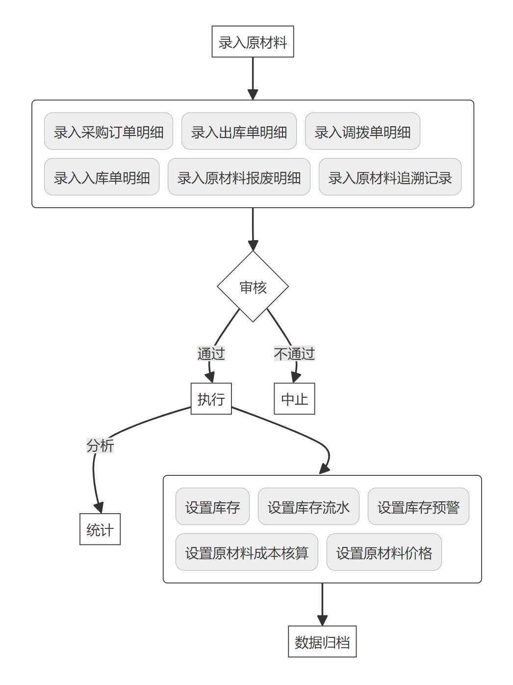 原材料管理功能定义包括数据录入、查询、变更、审核与统计分析。普通员工负责通过系统界面输入或修改原材料信息,如编码、名称等;供应商信息则由采购部门维护并更新联系方式及评价标准等内容;库位管理和库存实时监控可快速查看各仓库的材料分布和存储状态,并支持调拨操作;质量检验记录确保每批原料符合质量要求。审核环节主要用于检查录入数据准确性与合规性,普通员工提交的信息需经部门领导审批确认后再进行下一步处理或入库等动作;统计分析则通过系统生成各类报表提供决策依据,涵盖库存总量、原材料使用效率等多个维度的数据展示和图表呈现,使管理者能全面了解现状并制定相应策略。