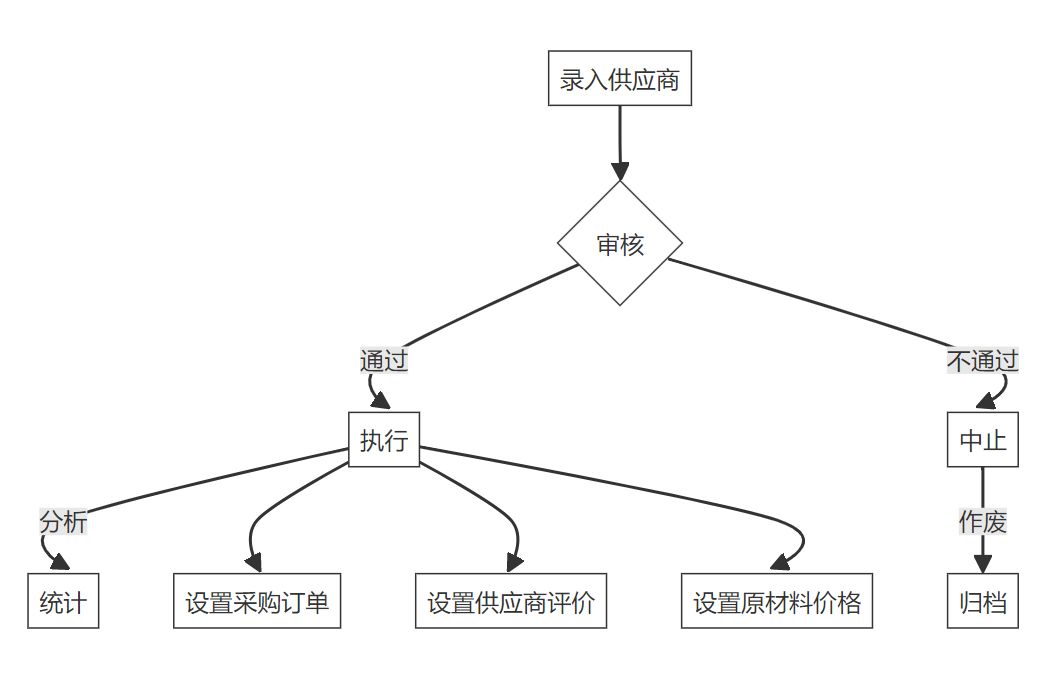 供应商管理中涉及的主要角色有普通员工和部门领导。普通员工负责录入、查阅及更新供应商信息,如编码、名称等;部门领导则进行数据审核与统计分析确保准确性与完整性。此模块具体用例包括:1) 供应商基本信息维护-添加/修改/删除供应商详情(姓名、联系方式等)。2) 数据验证检查-输入字段有效性和一致性校验。3) 审核流程管理-提交待审,领导审批并反馈结果。4) 查询统计功能-按条件检索供应商信息,并生成相关报表供决策参考。