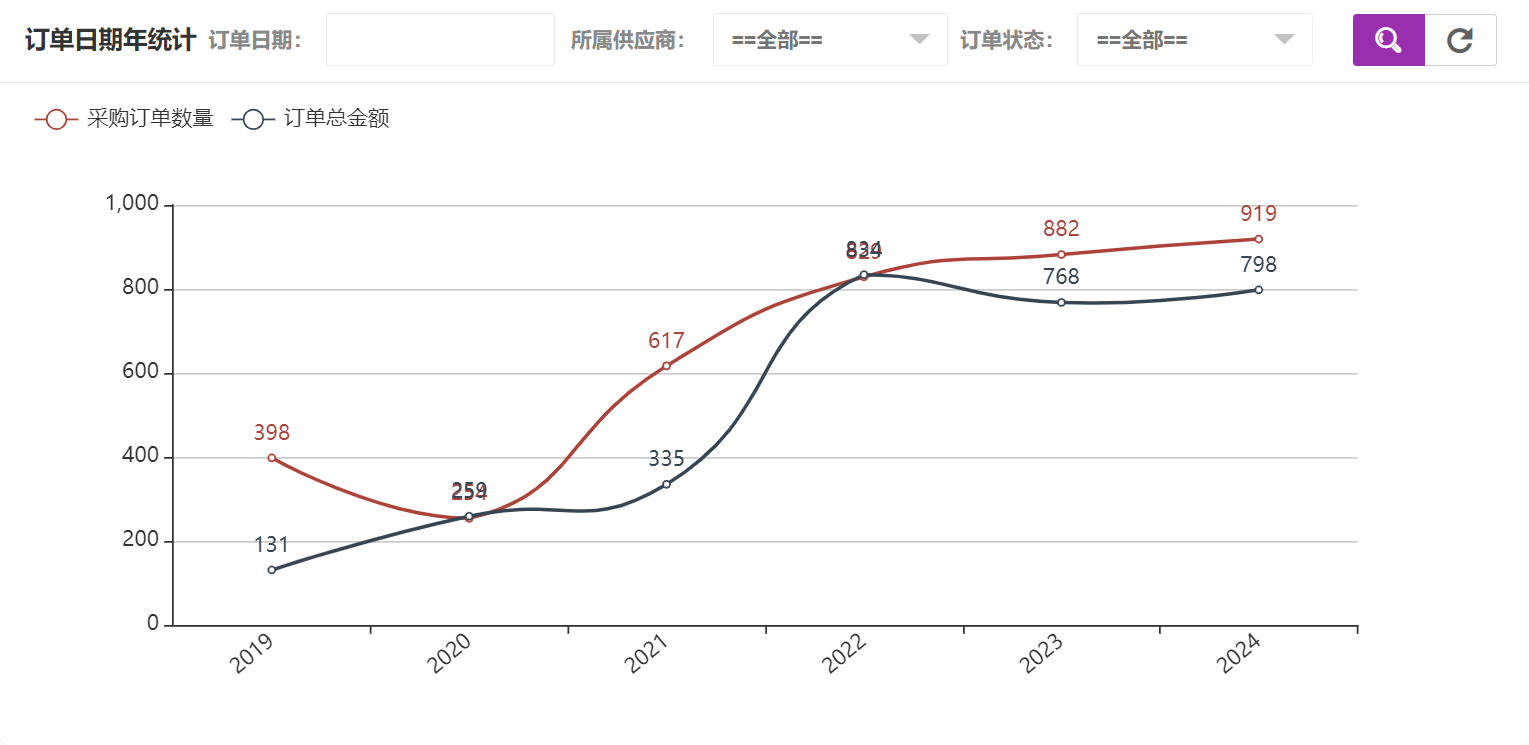 在采购订单统计中可以看到所属供应商统计、订单日期年统计、订单日期月统计、订单日期日统计、预计交货日期年统计、预计交货日期月统计、预计交货日期日统计、实际交货日期年统计、实际交货日期月统计、实际交货日期日统计、订单状态统计,订单日期年统计如图所示: