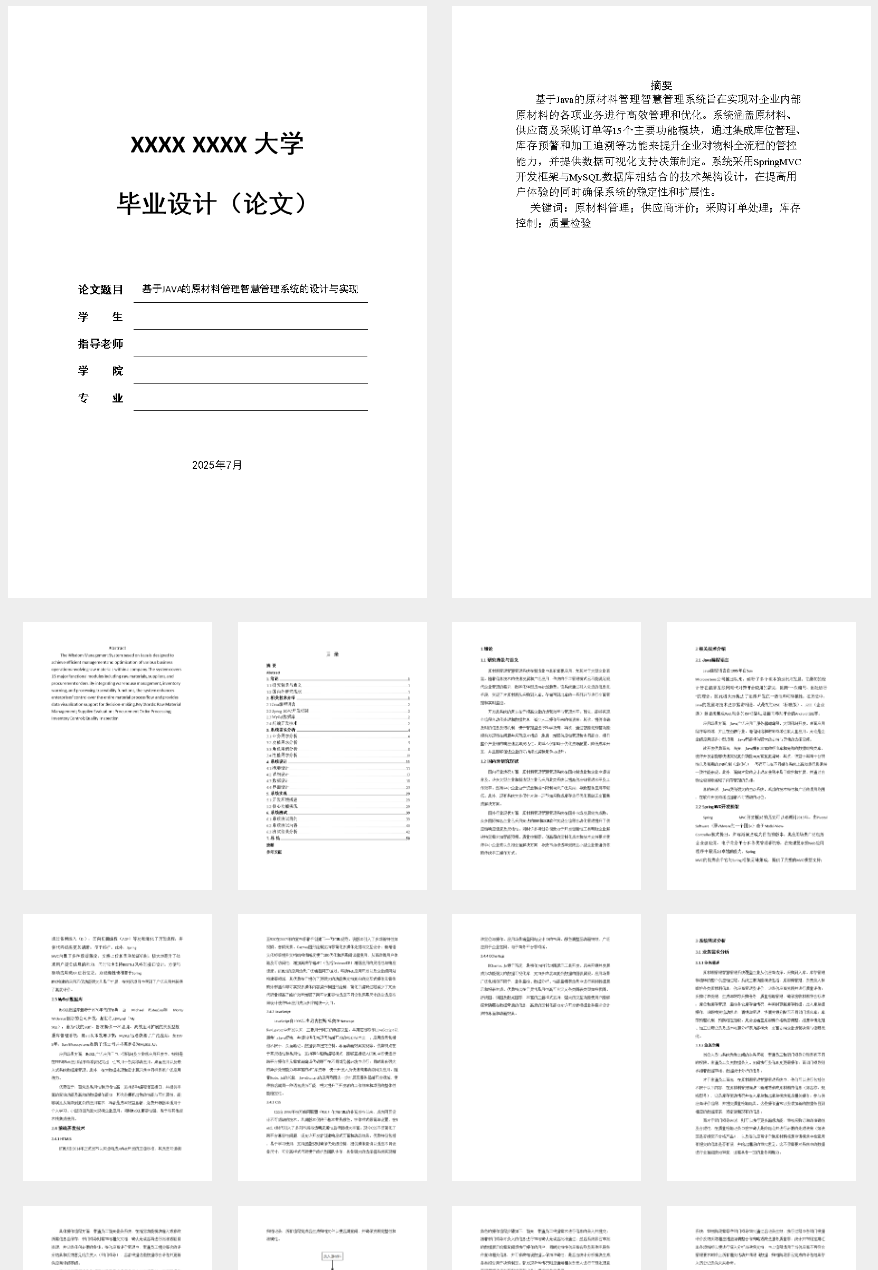 原材料管理智慧管理系统旨在提升传统管理模式的效率与精准度。该系统集成了多种功能模块,不仅涵盖了从原料采购到入库出库全流程管理,还包括供应商评价、质量检验和成本核算等多个方面。对比传统的选题,“烂大街”常涉及单一或简单流程优化问题,而本系统的全面性使其更具创新性和实用性,在实际应用中能够显著提升管理水平与效率。 系统设计简洁合理,并注重用户体验,确保普通员工易于操作数据录入及查阅,部门领导能快速进行审核和统计分析。采用SpringMVC开发框架和MySQL数据库管理后端逻辑与数据存储,前端界面通过JavaScript实现交互性增强。此外,ECharts.js用于数据可视化展示,使各类报表更加直观易懂。 系统实现了原材料从入库、出库到加工及追溯的全生命周期跟踪,并结合供应商信息管理和质量检验结果等关键因素,构建了一套高效规范的工作流管理系统。这不仅有助于减少错误和提高工作效率,还能显著提升企业的运营管理水平与竞争力。
