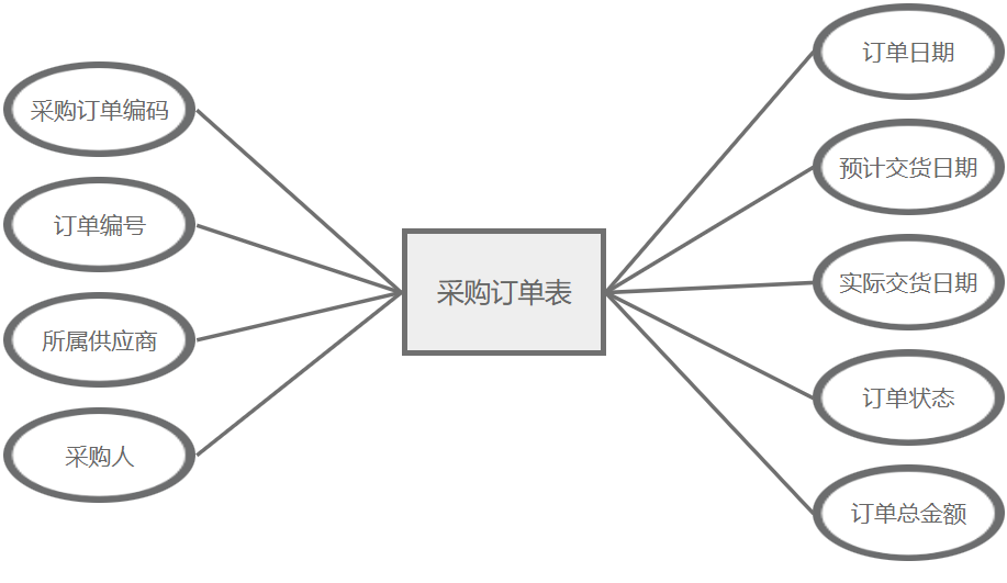 采购订单管理主要属性包括:采购订单编码、订单编号、所属供应商、采购人、订单日期、预计交货日期、实际交货日期、订单状态、订单总金额。
