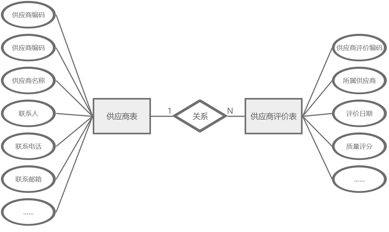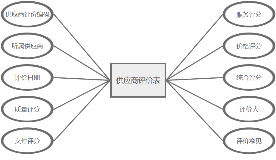 供应商评价管理主要属性包括:供应商评价编码、所属供应商、评价日期、质量评分、交付评分、服务评分、价格评分、综合评分、评价人、评价意见。