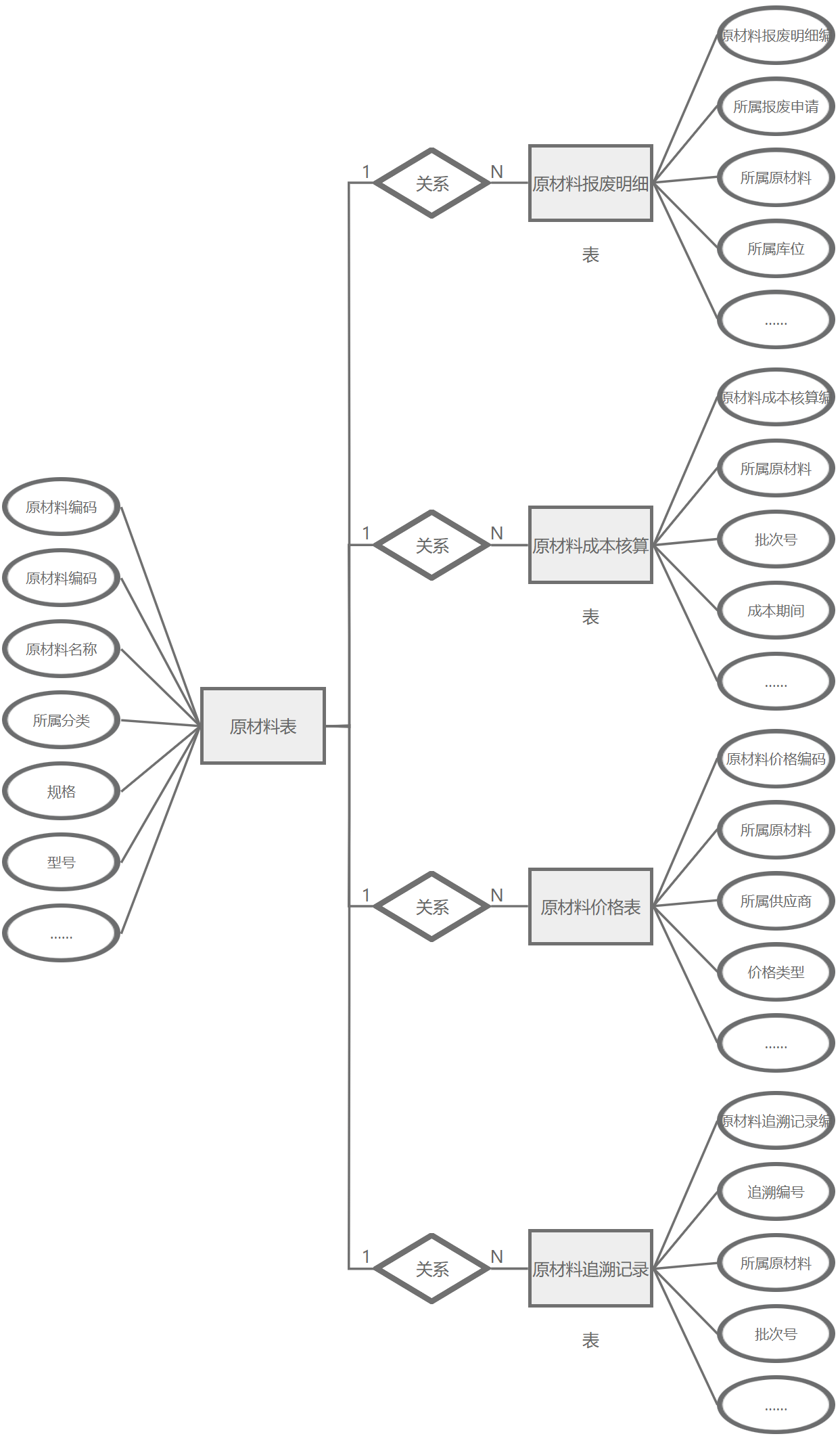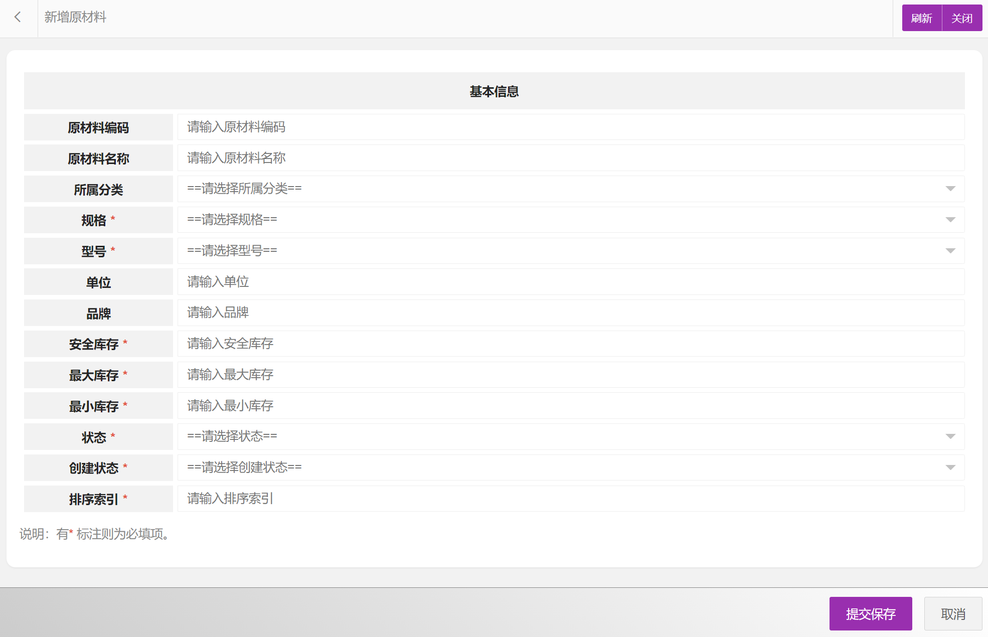 原材料管理主要属性包括:原材料编码、原材料编码、原材料名称、所属分类、规格、型号、单位、品牌、安全库存、最大库存、最小库存、状态。