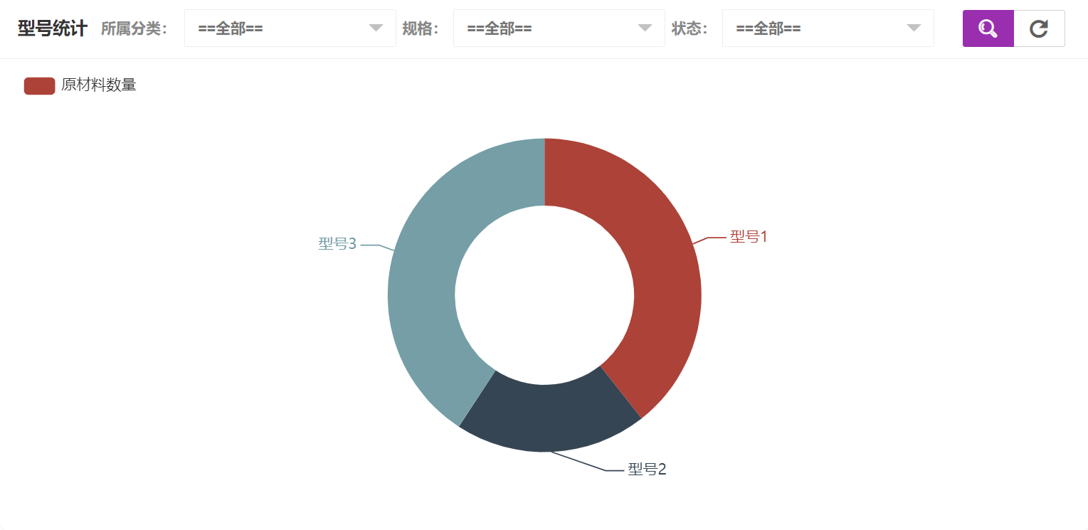 在原材料统计中可以看到所属分类统计、规格统计、型号统计、状态统计,型号统计如图所示: