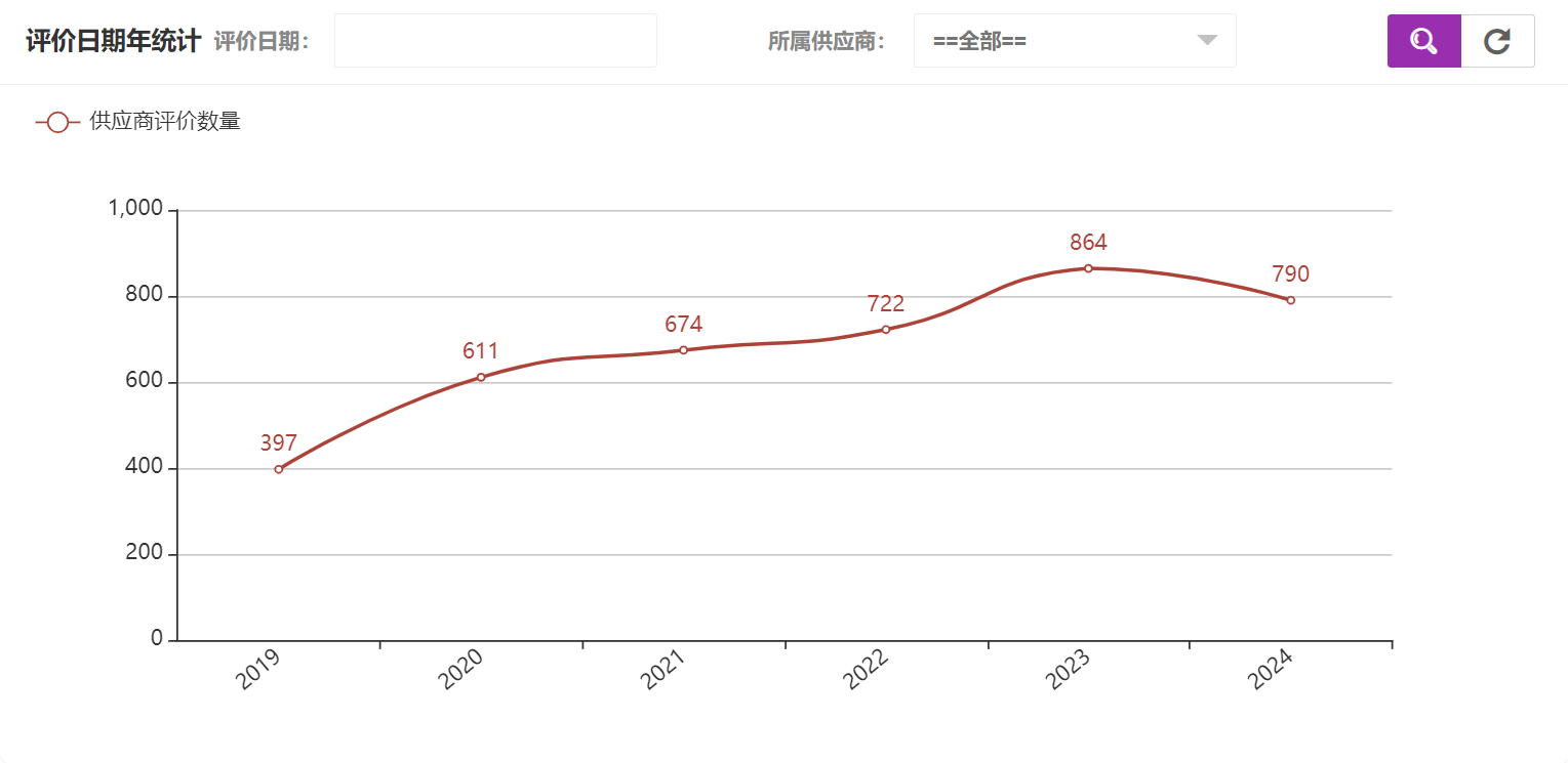在供应商评价统计中可以看到所属供应商统计、评价日期年统计、评价日期月统计、评价日期日统计,评价日期年统计如图所示: