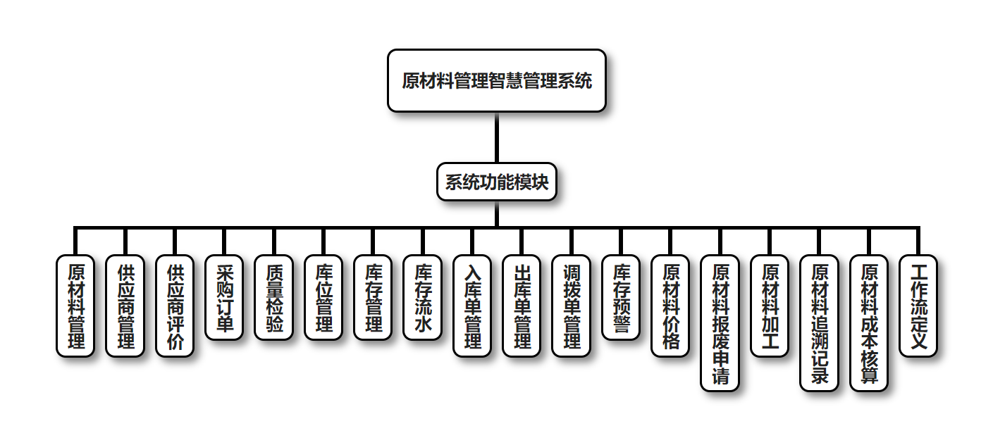 原材料管理智慧管理系统的主要功能包括:原材料管理、供应商管理、供应商评价管理、采购订单管理、质量检验管理、库位管理、库存管理、库存流水管理、入库单管理、出库单管理、调拨单管理、库存预警管理、原材料价格管理、原材料报废申请管理、原材料加工管理、原材料追溯记录管理、原材料成本核算管理、工作流定义管理。