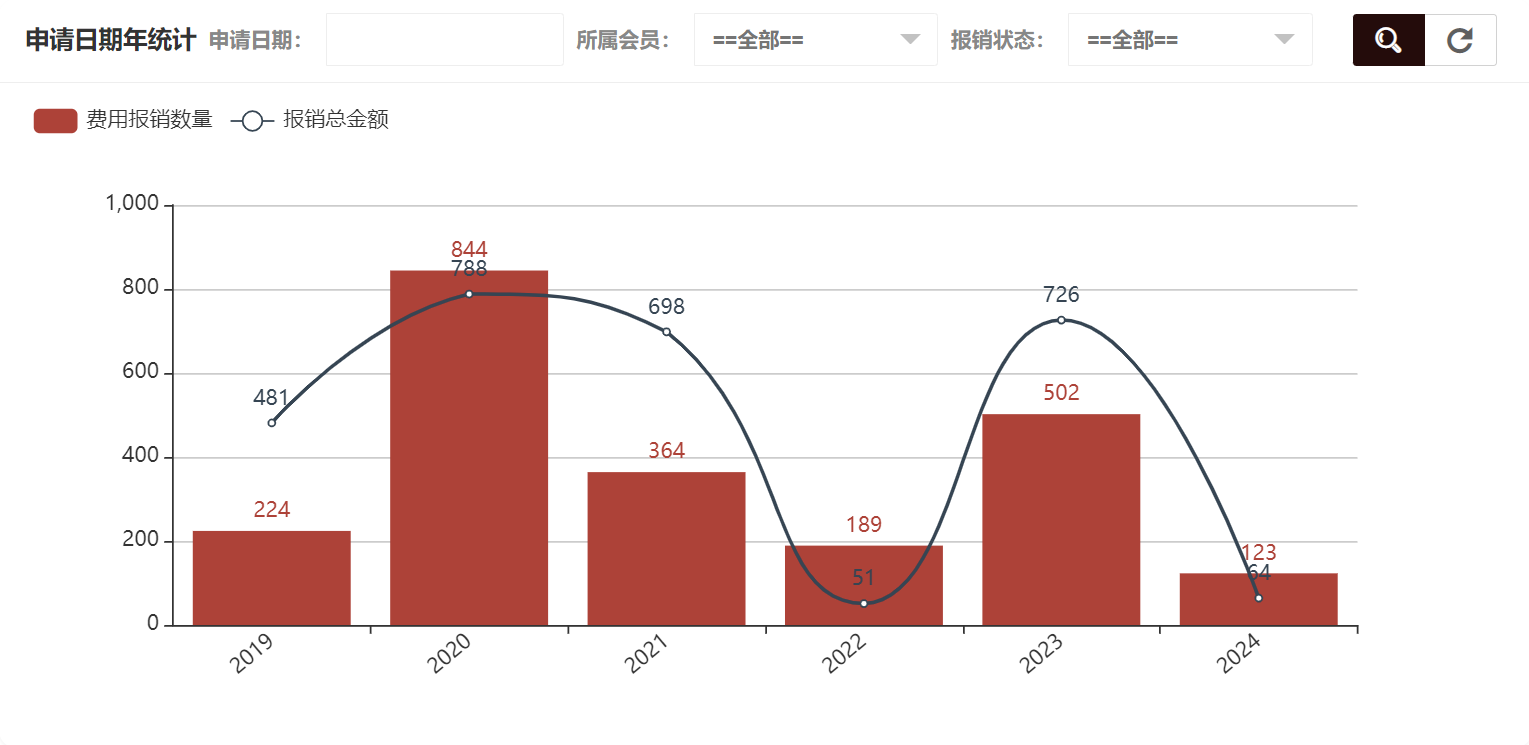 在费用报销统计中可以看到所属会员统计、申请日期年统计、申请日期月统计、申请日期日统计、报销状态统计、审批时间年统计、审批时间月统计、审批时间日统计,申请日期年统计如图所示: